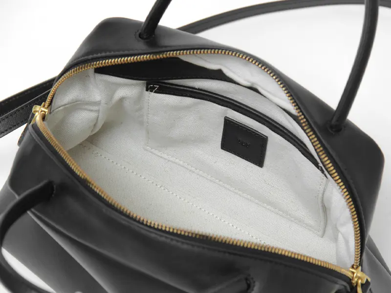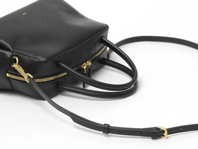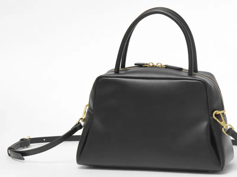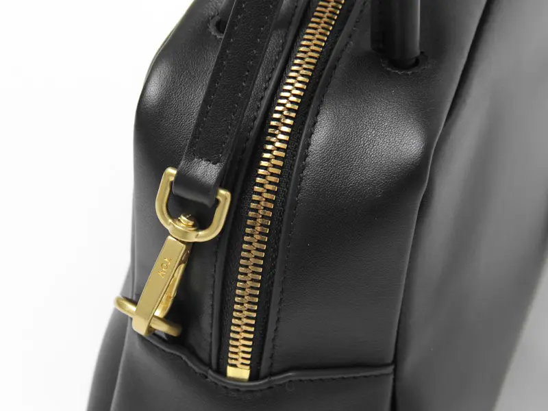 本体には滑らかな質感が特徴の牛革を使用。ハリがあり、キメが細かい滑らかなスムースレザーは、光が当たるとほんのり艶感があり、無機質な佇まいがシルエットを引き立てます。落ち着いた雰囲気で、コディネートをぐっと引き締めてくれます。