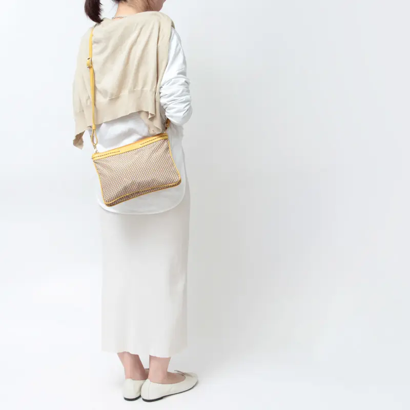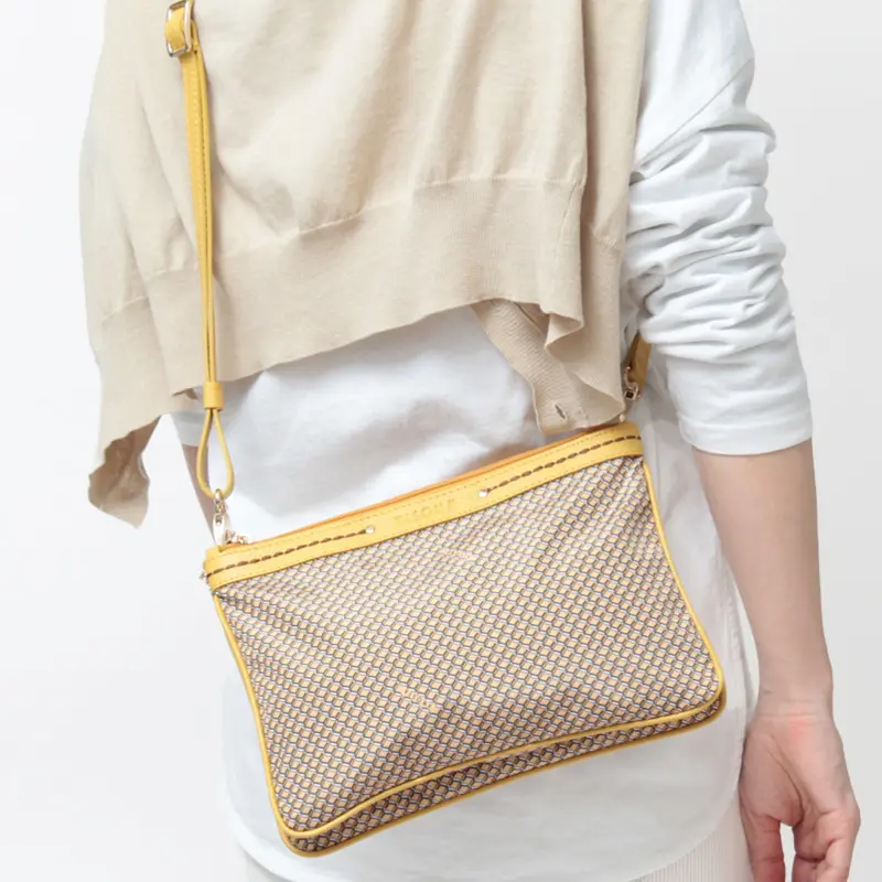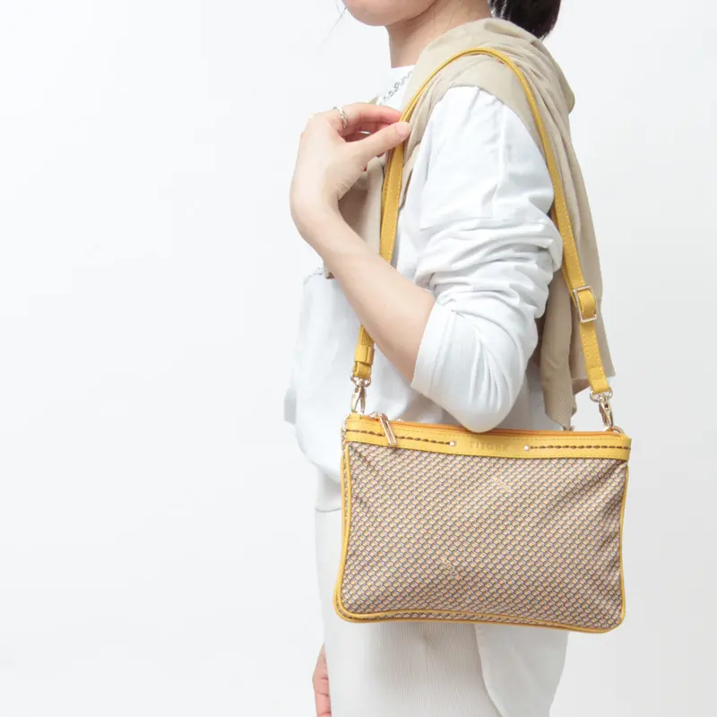 ショルダーストラップは長さ調節ができ、肩掛けや斜め掛けでお持ちいただけます。とても軽くコンパクトなので、普段使いはもちろん、ショピングや旅先での街歩きも身軽で便利です。ゴールドの金具がさりげないアクセントとなり、洗練された大人の装いを引き立てます。