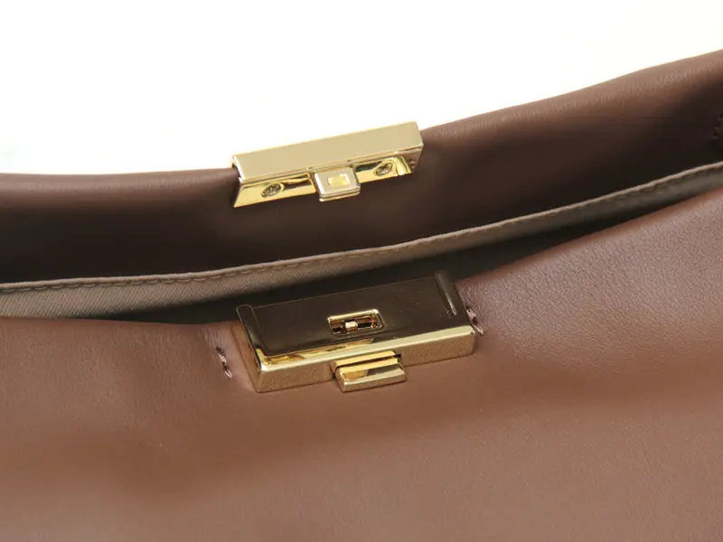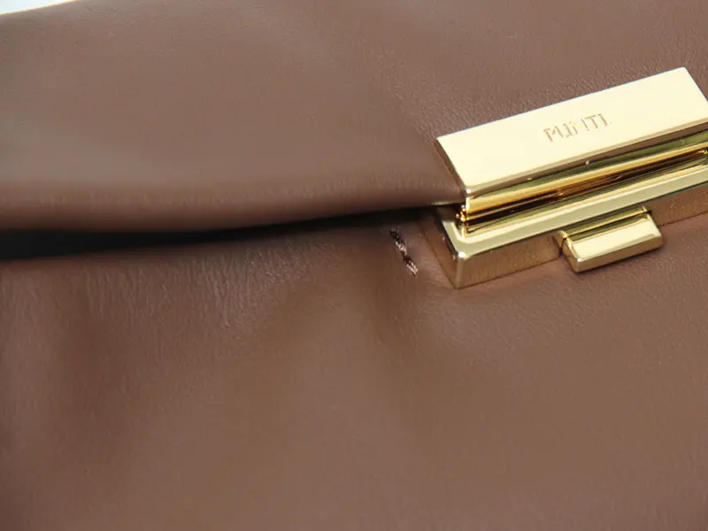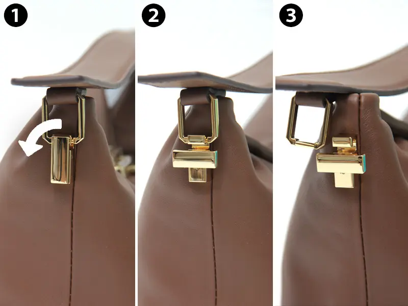 矢印方向に押すと金具が開く仕様です。ワンタッチで開閉しやすい口元のオリジナル金具が、上品で洗練された印象を添えます。