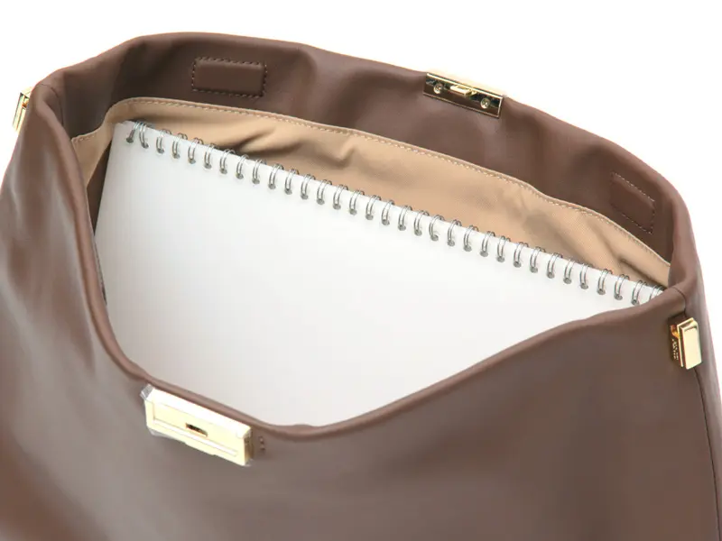 A4サイズのノートやファイルがすっきり収まり、普段のお出かけの必需品に加え、500mlペットボトルや折り畳み傘などもしっかり収まります。内側にはオープンポケットやファスナーポケットが1つあり、スマホや定期など小物の収納に便利です。