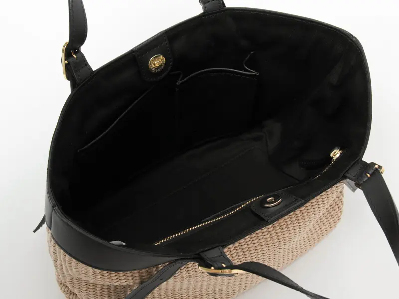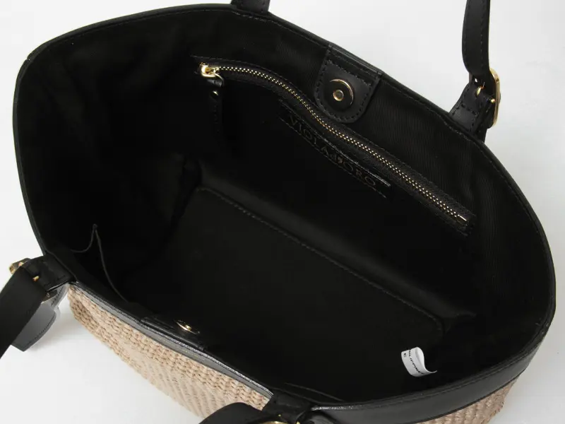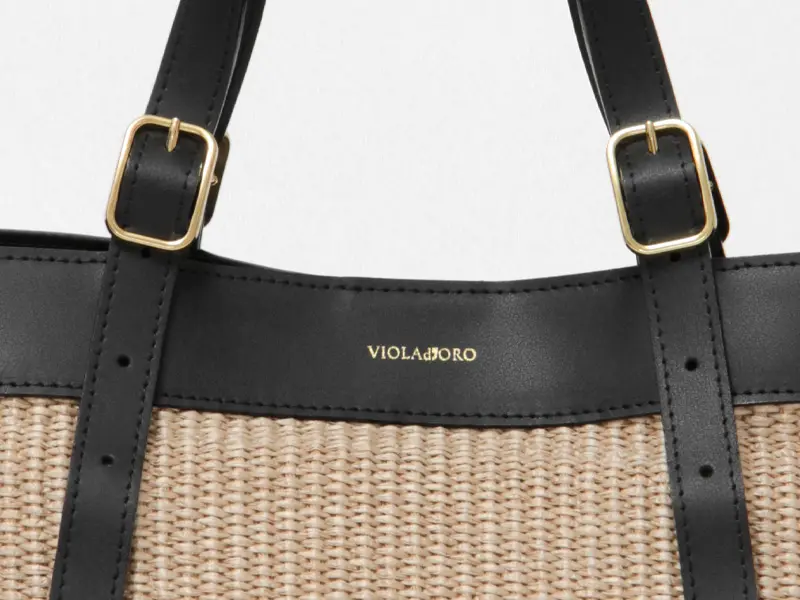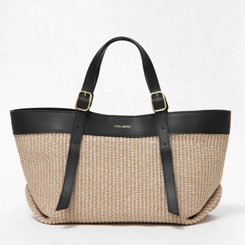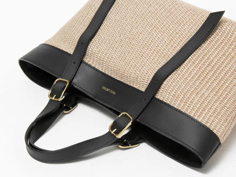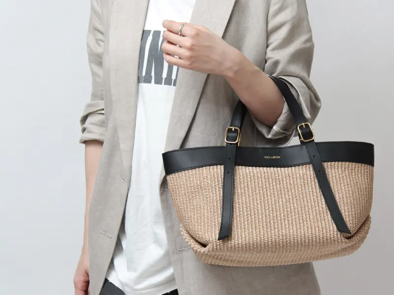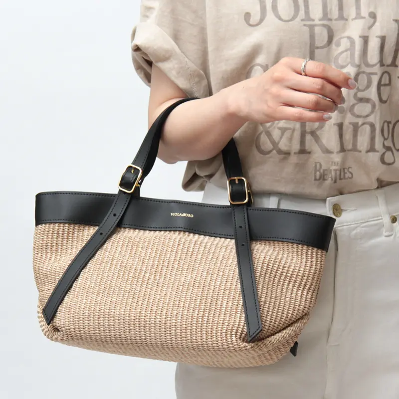 ラフィア調の涼しげな素材感が季節感を高めてくれる"VIOLAd'ORO ヴィオラドーロ"のトートバッグ。スクエアシルエットに上質レザー使いがスタイリッシュで、大人の女性に相応しいシックなデザイン。必需品+αが収まる収納量で、春夏のデイリーバッグや通勤バッグにおすすめです。