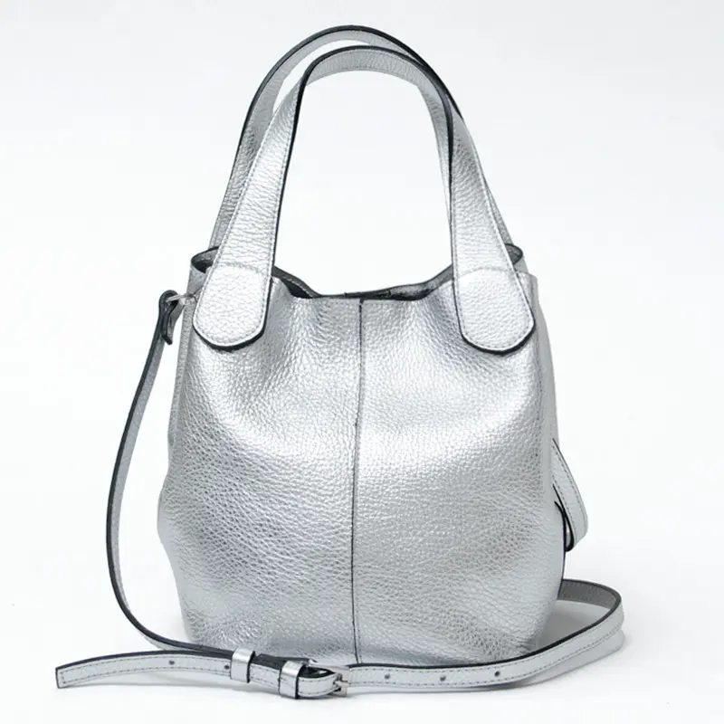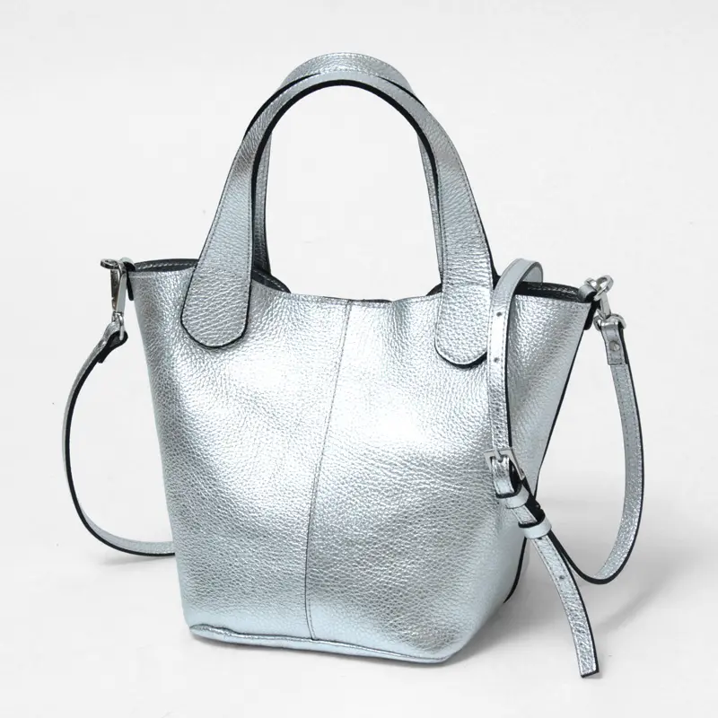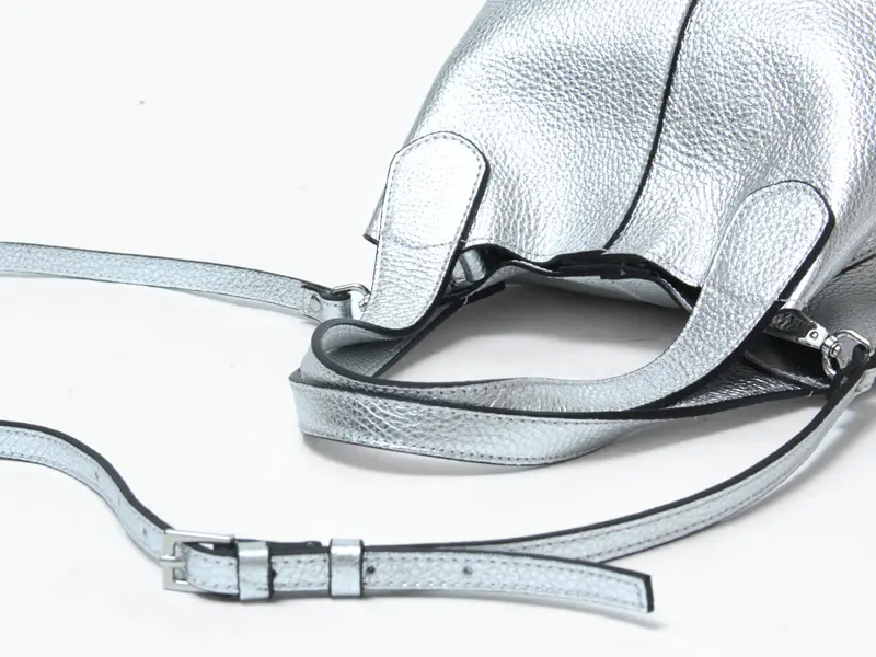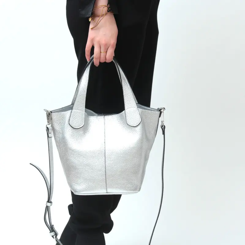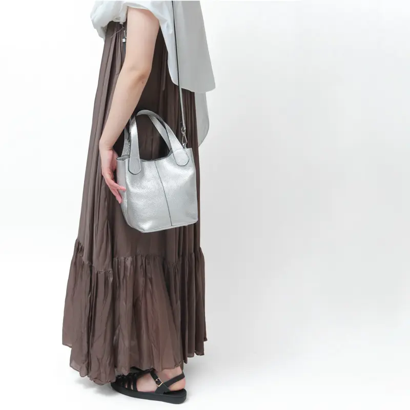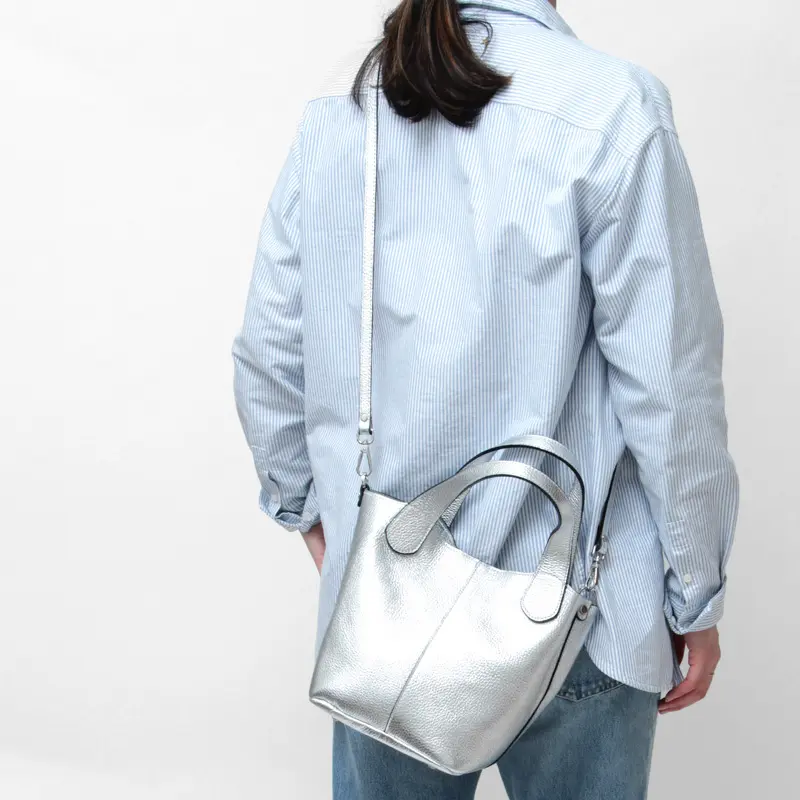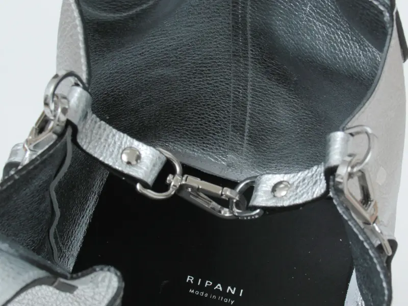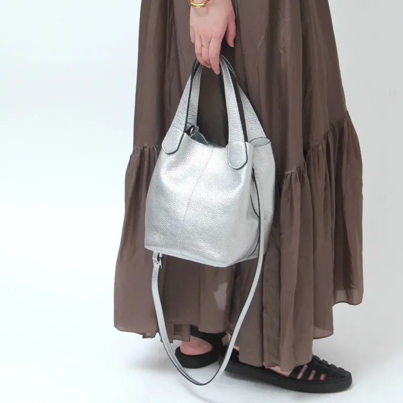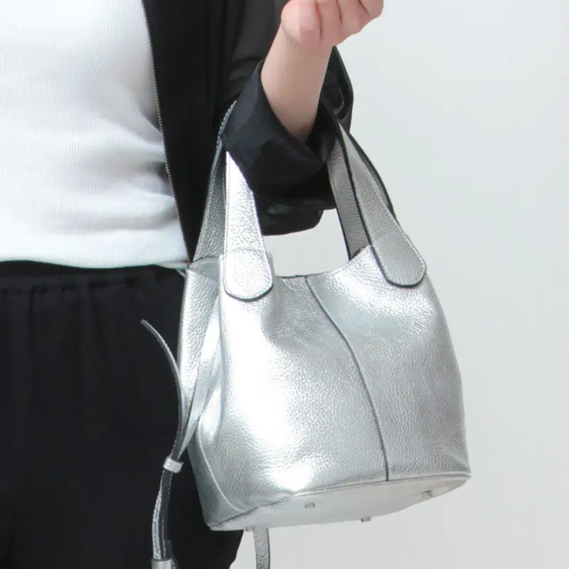 イタリアブランドRIPANI(リパーニ)のANNA(アンナ)は、上質な素材と洗練されたデザインが魅力のトートバッグです。一枚革ならではの柔らかさと愛らしいフォルムが特徴で、しっかりとしたマチ幅があり収納力も抜群。内側のフックを外すことで様々なフォルムにアレンジ可能です。さらに、ショルダーストラップを付ければ、肩掛けや斜め掛けとしてもお使いいただけます。上品なシルバーの輝きが、大人のスタイルをより魅力的に演出します。