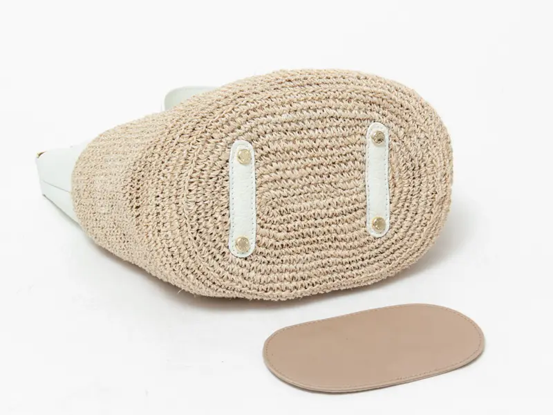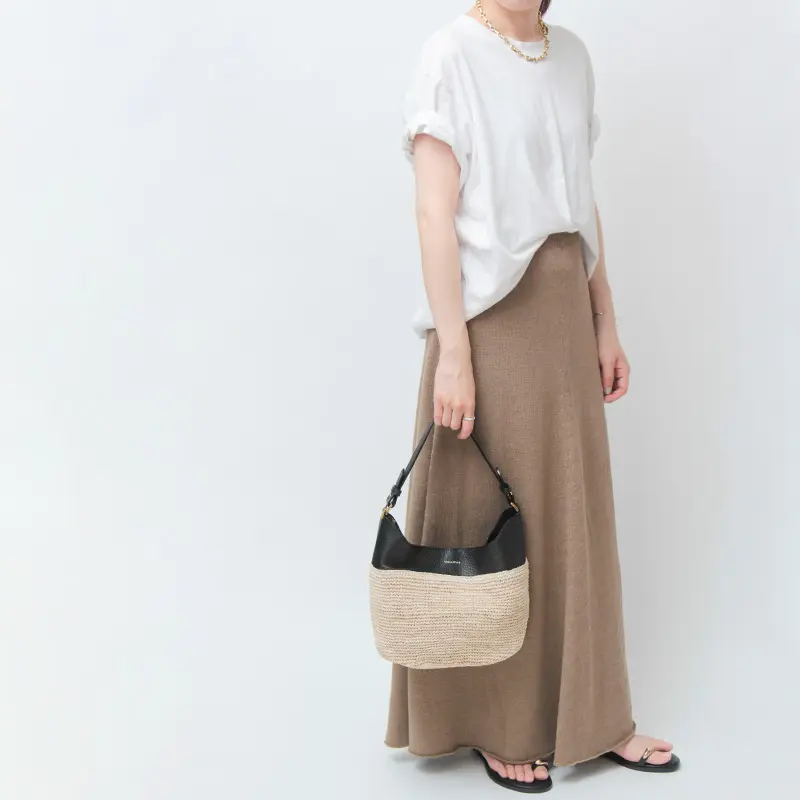 編み込まれたナチュラルラフィアと本革ハンドルが夏の装いを格上げする洗練デザイン。リラックス感のある大人カジュアルスタイルにマッチし、旅行や週末ランチ、お買い物スタイルまで幅広く活躍します。