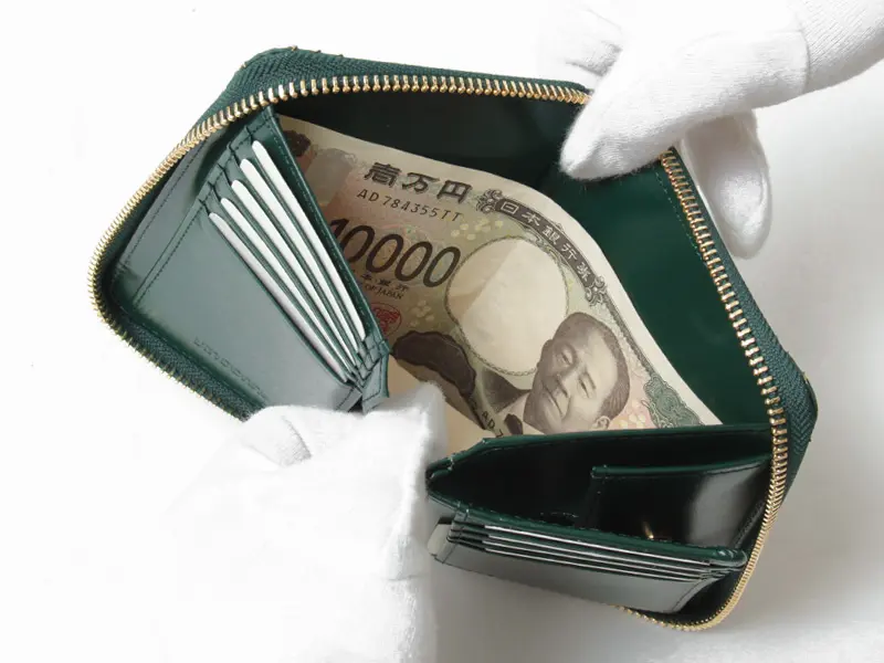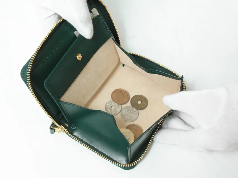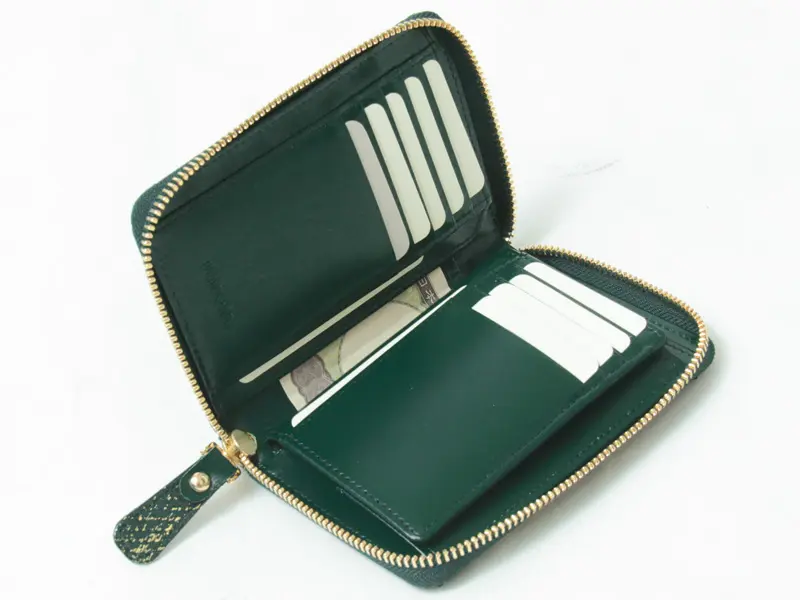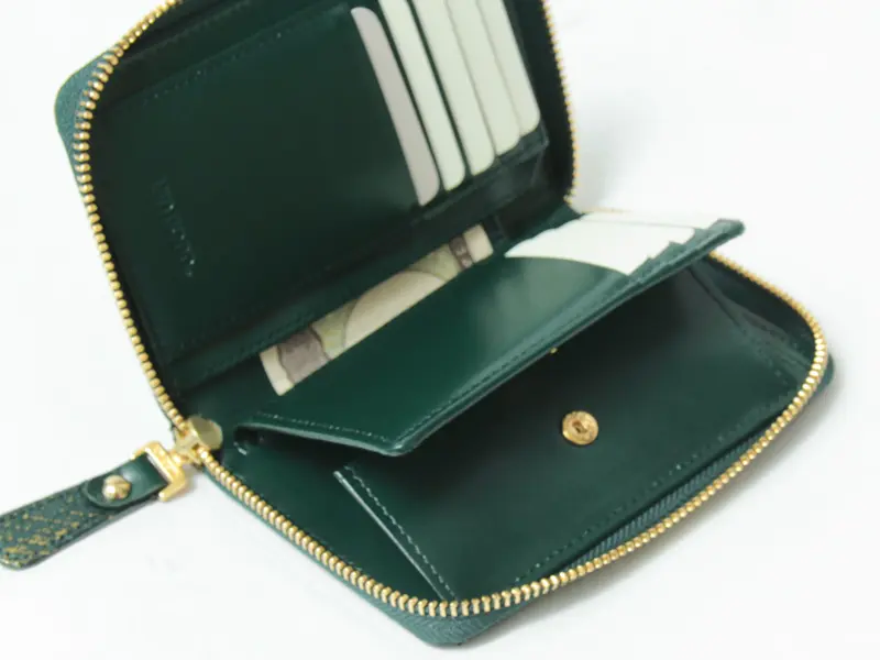 開閉はコの字型のラウンドファスナー仕様。厚さ2cmのスリムなデザインで、バッグの中でもかさばらず、ポシェットなどのミニバッグにもぴったり。コンパクトながらも収納力が高く、メイン財布としてもしっかり活躍してくれます。