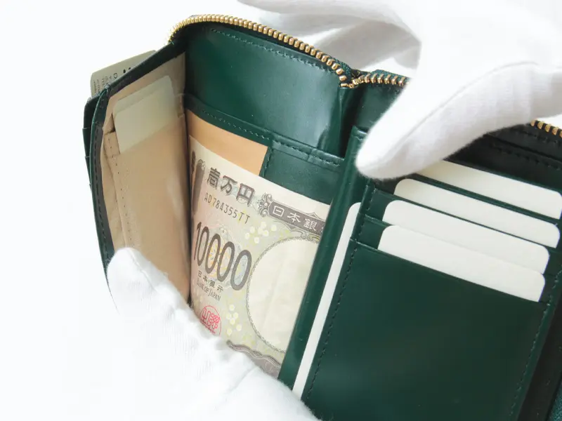 お札収納は奥と手前の2ヶ所。手前側の収納スペース左側にはカード入れが2ヶ所あり、中央の開いた個性的なデザインにより、紙幣やカードをスムーズに取り出せます。奥側の収納は深めに設計されており、高さのあるチケットや領収書の収納にも便利です。