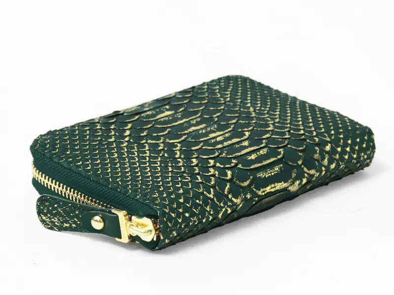 深みのあるグリーンが映える天然のパイソンレザーにゴールドの箔加工を施した"ベルデ"シリーズ。華やかなゴールドの財布は、バッグから取り出すたびに明るい気持ちになります。見た目の高級感だけでなく、本物の蛇革を使用した金運アップも期待できる縁起の良いサイフです。大きく開く小銭入れ付きの二つ折り財布でコンパクトながらメイン財布としてもご使用いただけます。