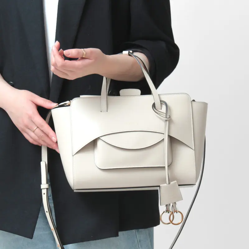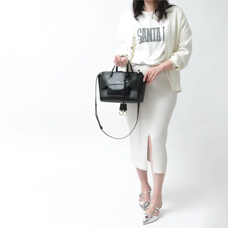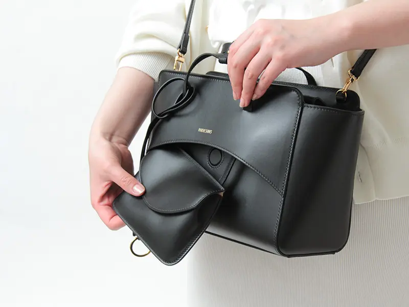 女性らしさを引き立てる華奢なレザーのハンドルは、平手デザインで手に優しくフィット。手持ちはもちろん、手首に通しても程よい長さで、使いやすい設計になっています。
