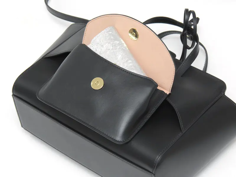 フロントのポーチがハンドル下のフラップにさりげなく隠れるユニークなデザイン。パスケースやリップなど、すぐに取り出したい小物の収納にぴったりの実用性も兼ね備えています。