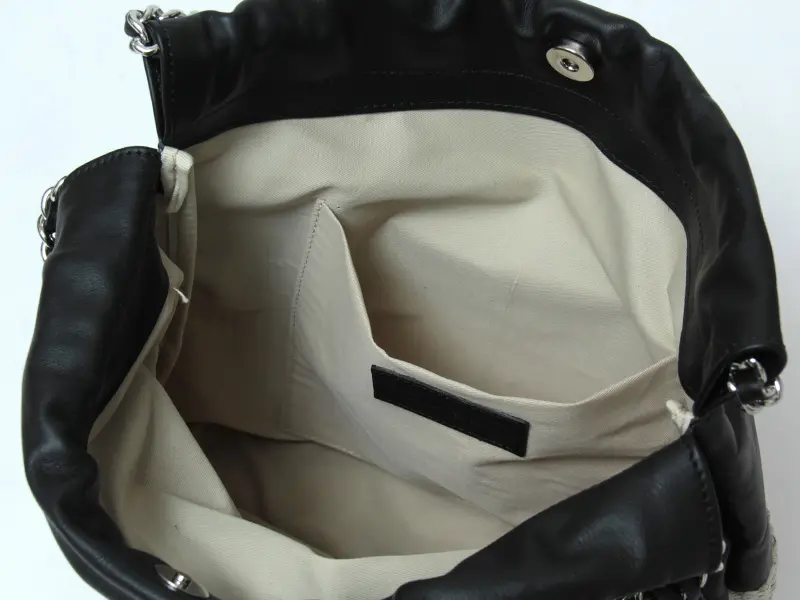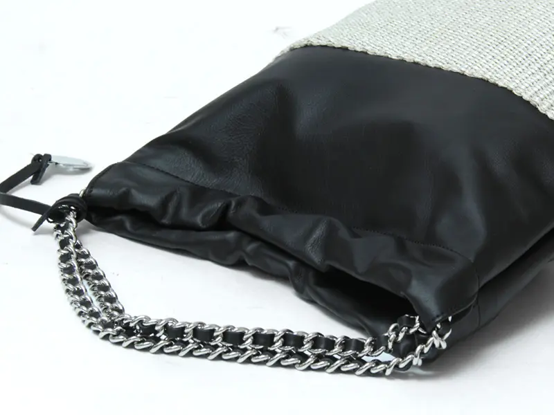 レザーを編み込んだチェーンハンドルが華やかさを添え、装いに高級感をプラスしてくれます。上品なディテールでありながら存在感があり、エレガントで洗練されたスタイルを演出します。