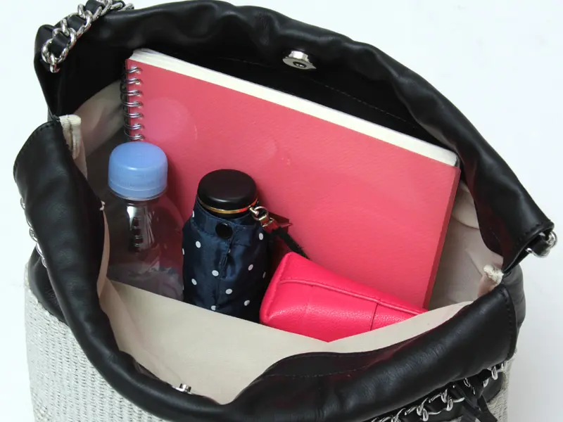 開閉はマグネット仕様。B5サイズのノートがきれいに収まるサイズ感で、長財布などの必需品に加え、500mlのペットボトル、折り畳み傘などの荷物も収納可能です。また、内側にはオープンポケットが1つ付いており、バッグの中で見失いがちなスマートフォンや小物を整理して収納するのに便利です。