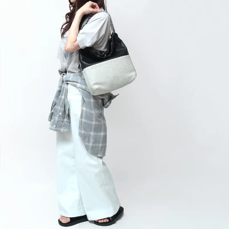 本体素材はソフトで滑らかなスムースレザーとイタリア製のラフィア調シートのコンビ。ラフィアシートは従来の手編みのかごバッグでは表現しづらいトレンド感のあるクリーンなデザインで、引っ掛かりのない滑らかな肌触りが特徴です。また天然素材に比べ、劣化しにくく、多少の雨でも安心してお持ちいただけます。レザーはかごバッグのナチュラルな雰囲気も、牛革との組み合わせで上品な仕上がりです。