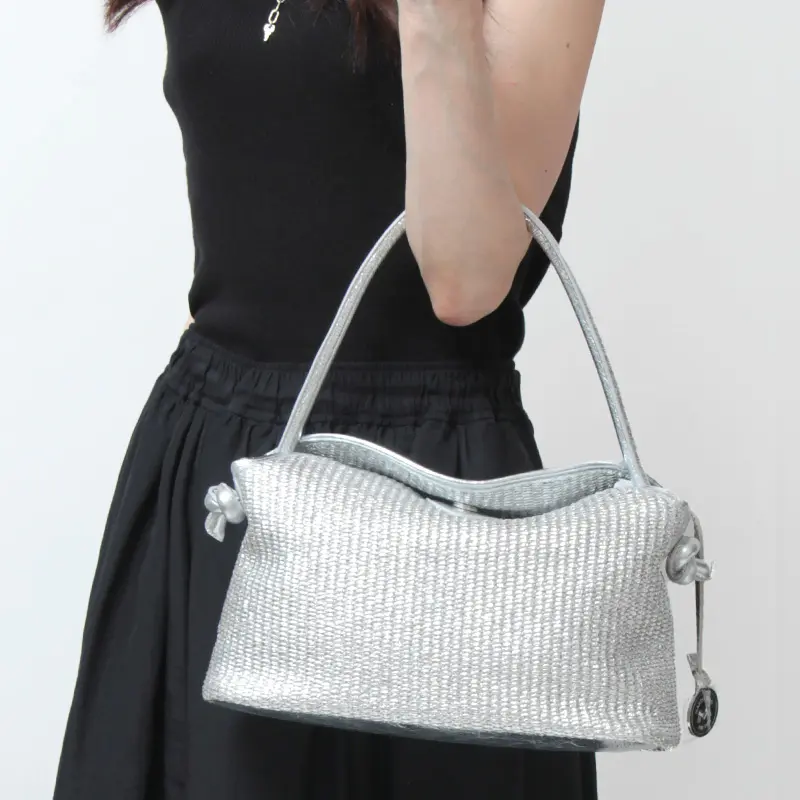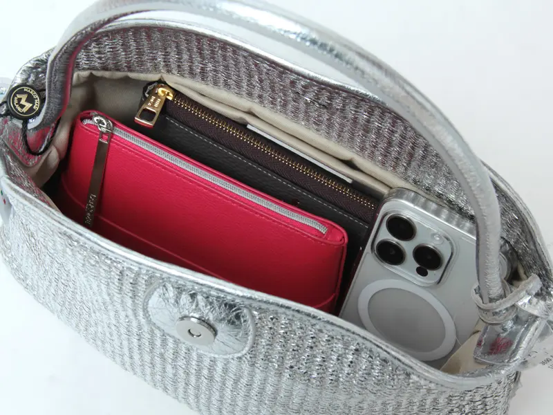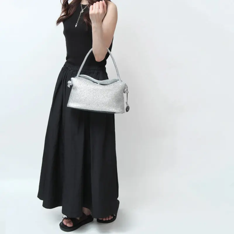 本体にはトレンド感あふれるメタリックカラーのラフィア調素材を使用。バッグ本体の重さが約280gと非常に軽い上に荷物もしっかり入るので、デイリーバッグに欲しいスペックを満たしてくれる優秀バッグです。