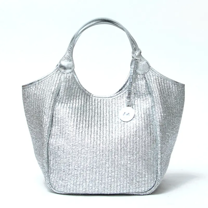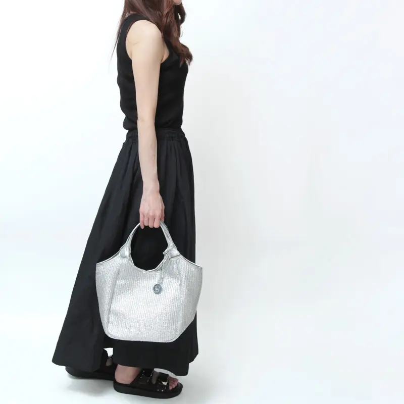 シルバーの煌めきで魅せる"MARCO MASI マルコマージ"のかごバッグ。シンプルなデザインなのできれいめからカジュアルまでマッチし、夏のコーディネートを涼しげに格上げ。長財布などの必需品に加え、ペットボトルや折りたたみ傘など+αの荷物がしっかり収まり、幅広いシーンでの活躍が期待できます。