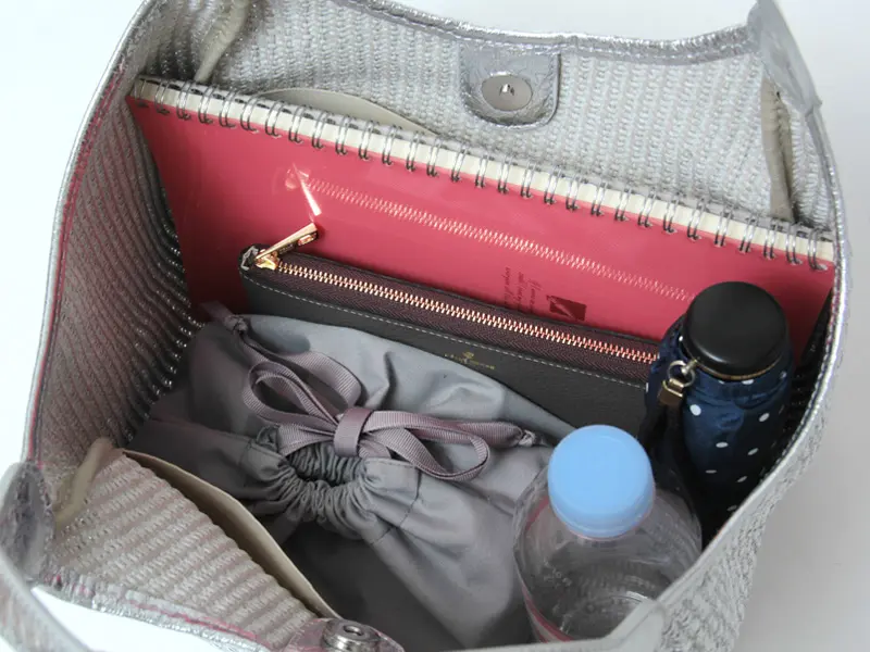 B5サイズが収まる大きさのトートバッグ。小さずぎず大きすぎず、使い勝手の良いサイズ感です。マチ幅がとても広く、見た目以上に大容量。長財布など普段のお出かけの必需品に加え、お弁当やペットボトルも収まりお仕事バッグにも最適です。