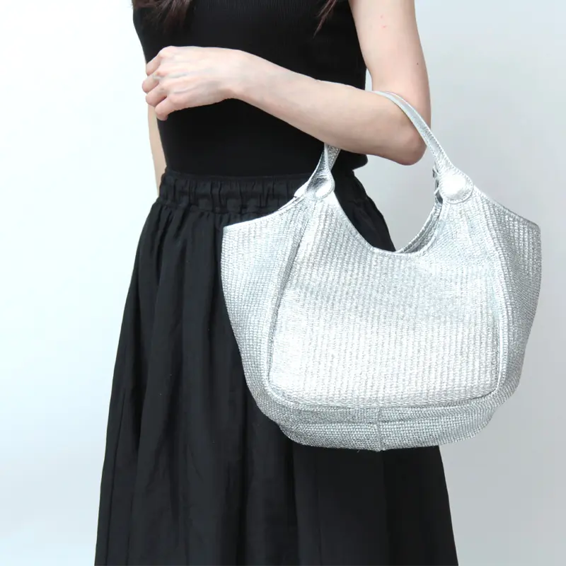 本体にはトレンド感あふれるメタリックカラーのラフィア調素材を使用。バッグ本体の重さが約280gと非常に軽い上に荷物もしっかり入るので、デイリーバッグに欲しいスペックを満たしてくれる優秀バッグです。