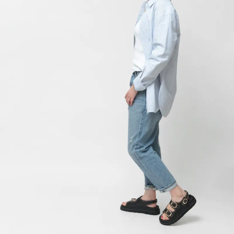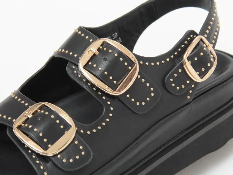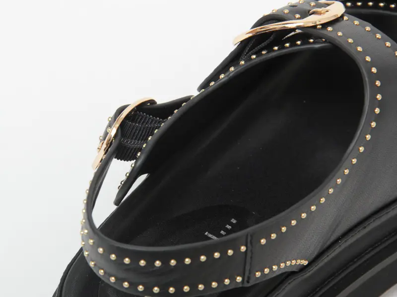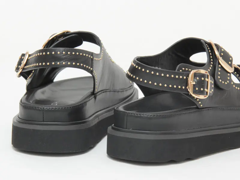 アッパーを縁どるようにあしらったゴールドスタッズがスタイリングのポイントになるダブルストラップサンダル。ボリューム感のあるフォルムが今年らしく、取り入れるだけで旬なスタイリングに昇華。シンプルながらもパンチの効いたデザインは、カジュアルなデニムにはもちろん、シックなモードスタイルにもおすすめです。