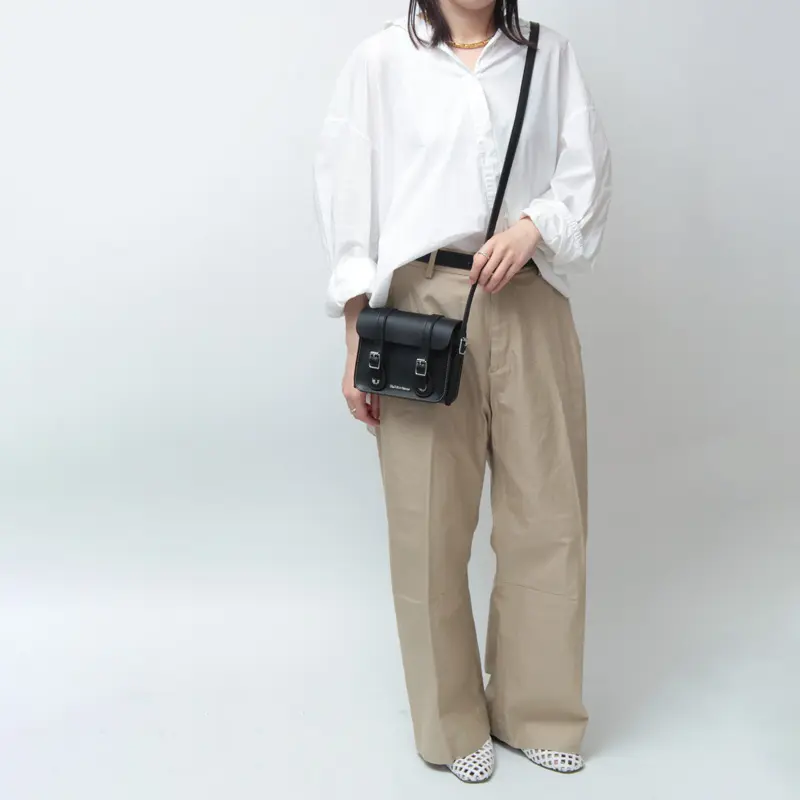 スマートフォン、ミニ財布、ハンカチなどがスッキリ収まるサイズ感。開閉はマグネット付きのフラップ仕様で、スムーズに開け閉めできてストレスフリーに使えます。