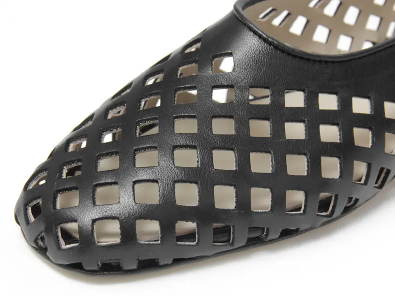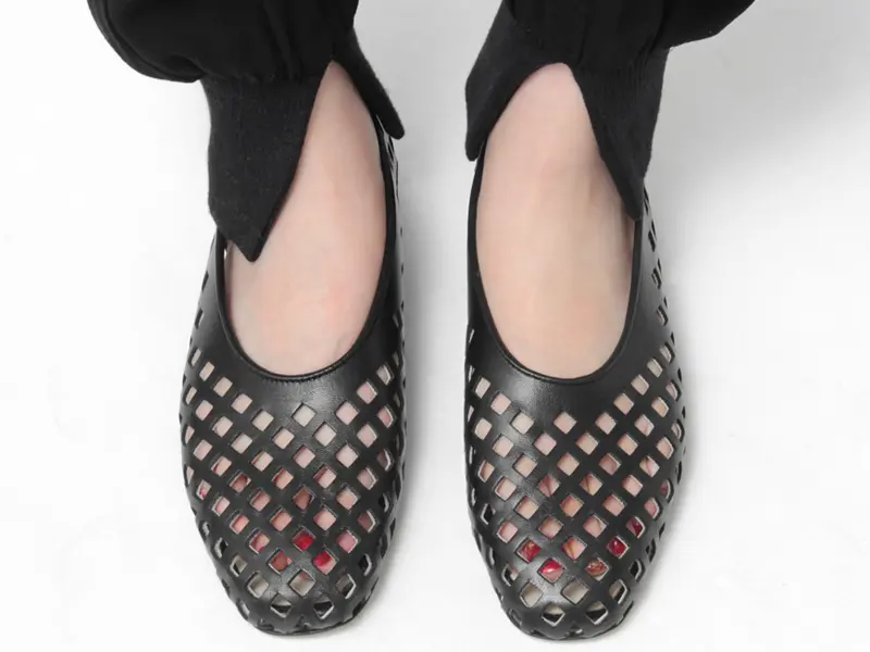 つま先は上品&女性らしさが叶う細めのラウンドトウ。履き口は深めのカッティングで、足を長く美しく見せてくれます。全面に施された四角いパンチングが涼やかな風合いを演出し、透け感が今年らしいデザインです。