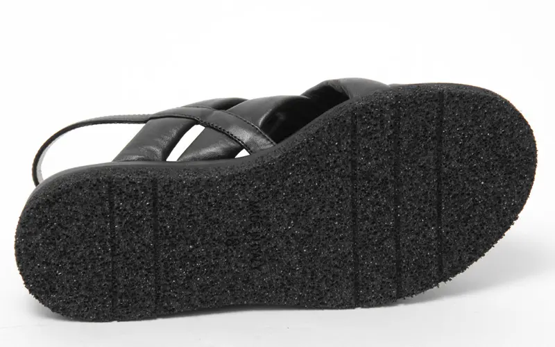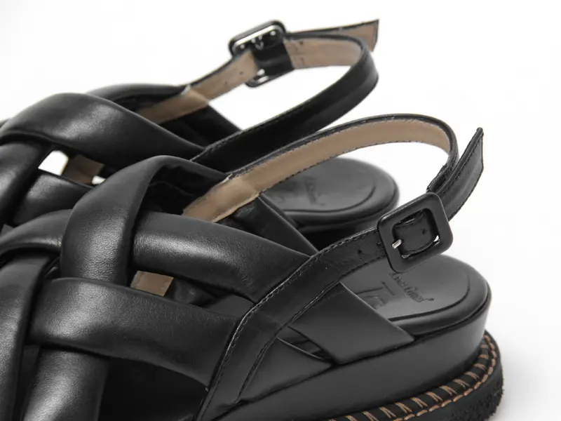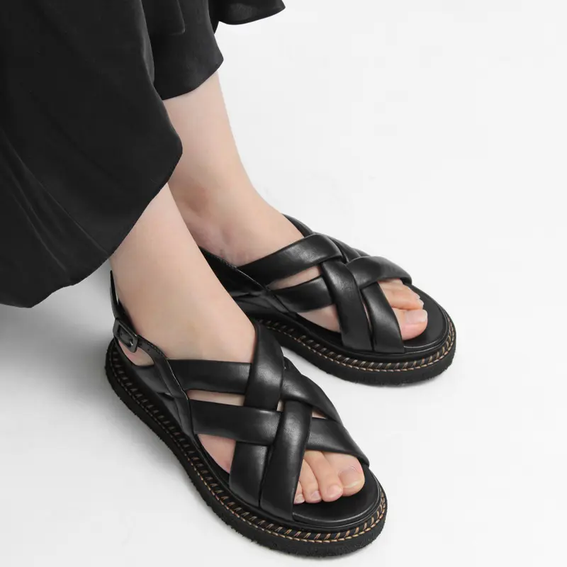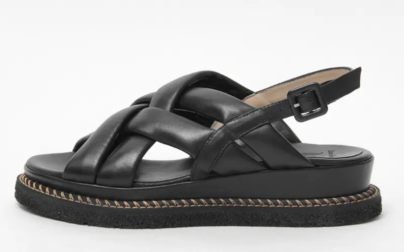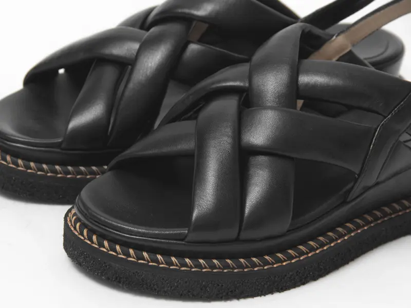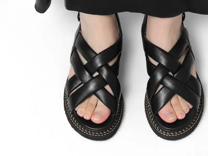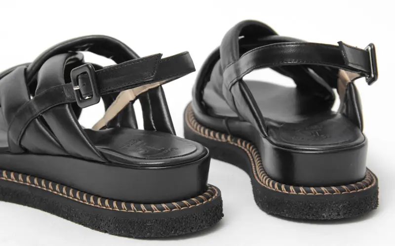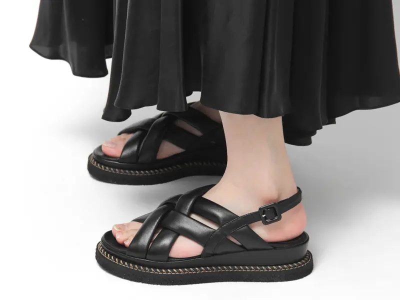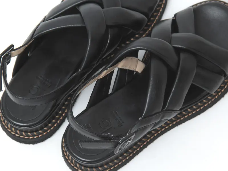 ふっくらとしたパフィー感のあるベルトが存在感を放ち、クロスデザインが自然と足を長く見せてくれます。柔らかなレザーが甲をしっかりホールドし、快適な履き心地を実現。ソールとアッパーの境の部分には飾りのステッチを施した巻革を配し、シンプルな一足に夏らしいアクセントを添えています。
