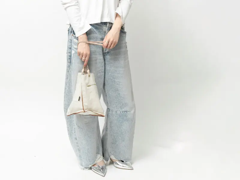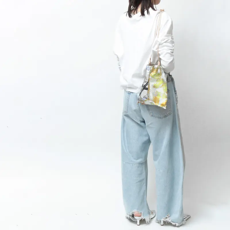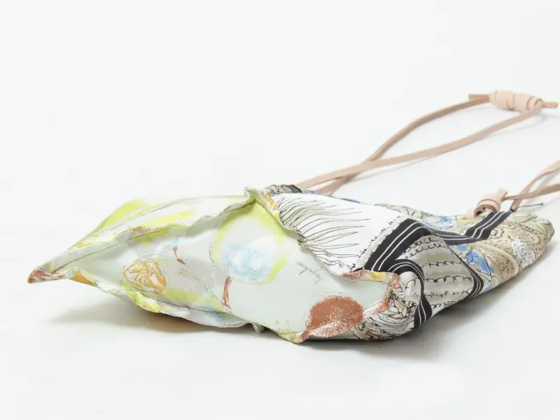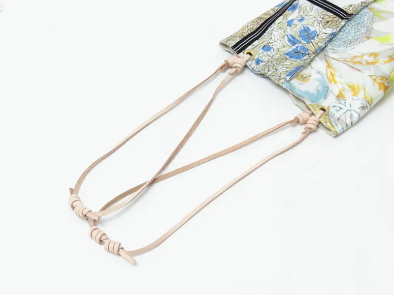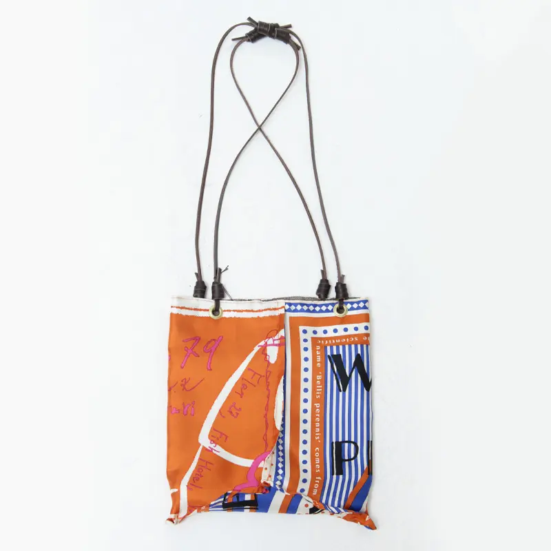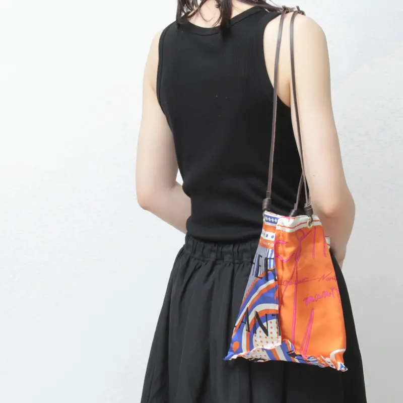 本体はシルク生地を使用し、ツルッとした滑らかな肌触り。持ち手は自由に長さの調節が出来るのでスタイルに合わせて手で持ったり、肩から掛けたり様々なスタイルでお持ちいただけます。