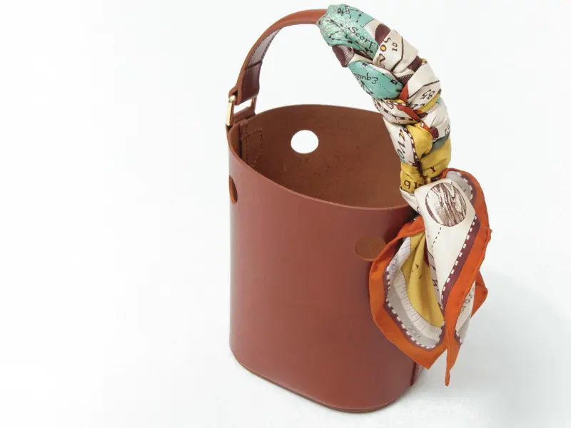 レザーバッグにスカーフを通す穴をデザインとして配置してあります。付属のスカーフは取り外しが可能で、お手持ちのスカーフを通して自由にアレンジ可能なのでシンプルなバッグが華やかな表情に変化します。シーズンを通して使えるデザインなのも魅力的です