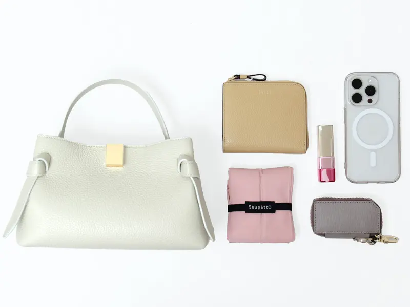 開閉はマグネット仕様。ミニ財布、スマートフォンなどの必要最低限の荷物が収まるサイズ感。