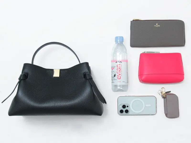 開閉はマグネット仕様。長財布やポーチなどの必需品に加え、500mlのペットボトルなども入る見た目以上の収納力です。
