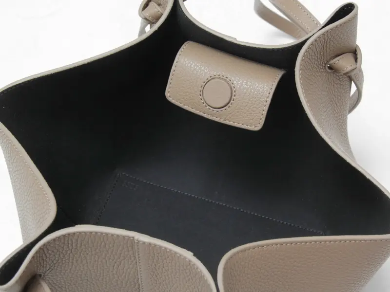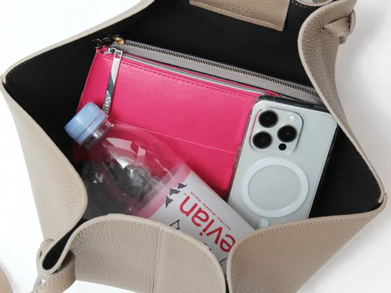 開閉はマグネット仕様。長財布やポーチなどの必需品に加え、500mlのペットボトルなども入る見た目以上の収納力です。口が大きく開き、バッグの中が見やすく出し入れもしやすく使い勝手の良さも魅力の一つです。