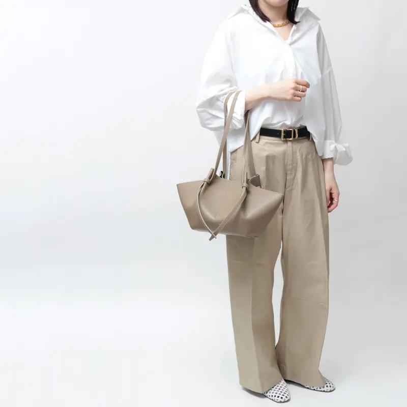 ころんとした丸みのあるシルエットに優雅に揺れる結び目がポイント。長めのハンドルはゆったり肩掛けも可能なので、実用性の高さも魅力です。少し細めで女性らしさも◎。また、結び目で長さを調整すれば、肩掛けや手持ちなど気分やコーデに合わせて持ち方を変えてお楽しみいただけます。