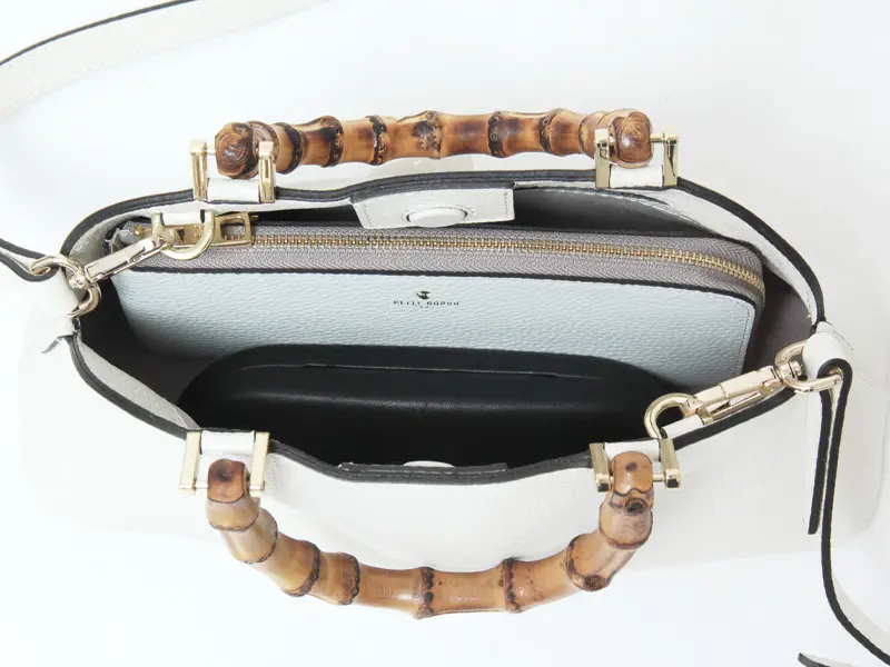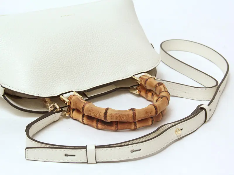 女性らしい上品な印象を与えてくれるバンブーの持ち手。手提げも腕に掛けても、さっと持つだけでお洒落に見せてくれます。 ショルダーストラップは取り外し可能。ギボシ留めでお好みの長さに調節していただけます。両手が空くので、通勤やお出かけにも便利にお使いいただけます。