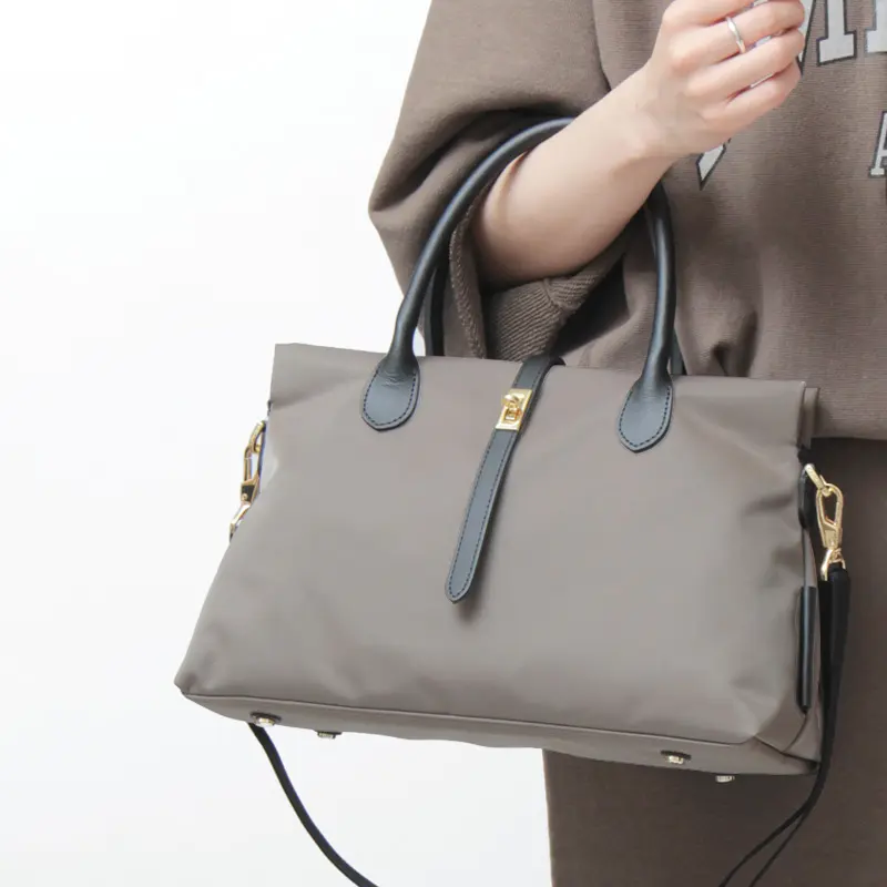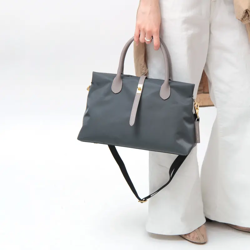 ハンドルはイタリアンレザー仕立て。マットな質感のナイロンとの組み合わせで、大人の女性が持ちやすい上品で高級な印象。取り外し可能なショルダーストラップが付いているので肩がけや斜めがけもできる2way仕様。お出かけやお子様とのお出かけもにも最適です。ゴールドの金具を使うことで、アクティブな日のカジュアルスタイルも女性らしく仕上げてくれます。