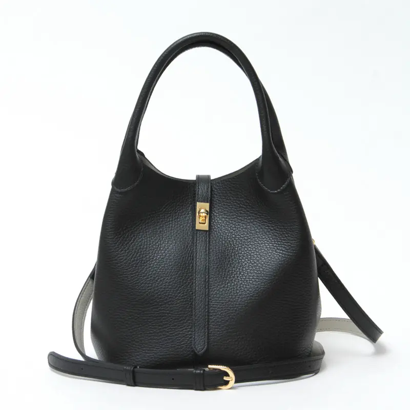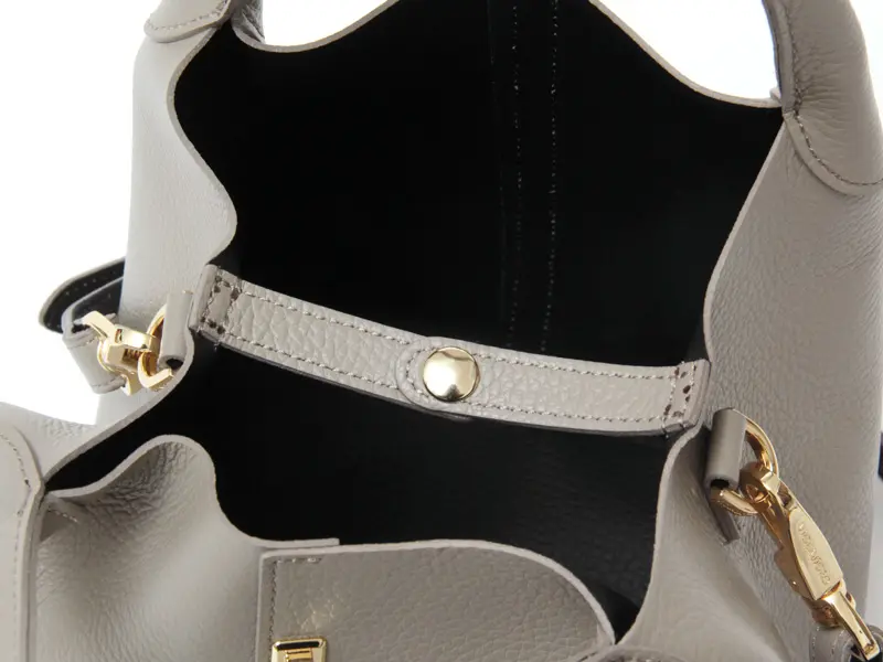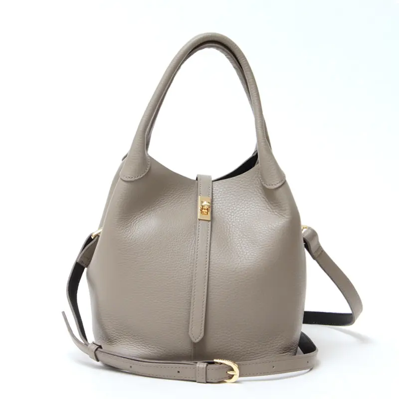 VIOLAd'oro(ヴィオラドーロ)の人気シリーズ「TRERO トレロ」から、大人の日常に寄り添うバケツ型バッグ。 フロントに配されたターンロックベルトが上品なアクセントとなり、シンプルながらも洗練されたクラス感を演出。 付属のショルダーストラップで肩掛けや斜め掛けも楽しめます。 広めのマチ設計により、長財布やペットボトルなどの必需品に加え、お出かけに必要なアイテムと+αの荷物もスマートに収納。 イタリアンWフェイスレザーを贅沢に使用した、しなやかな手触りと驚きの軽さが魅力の逸品です。