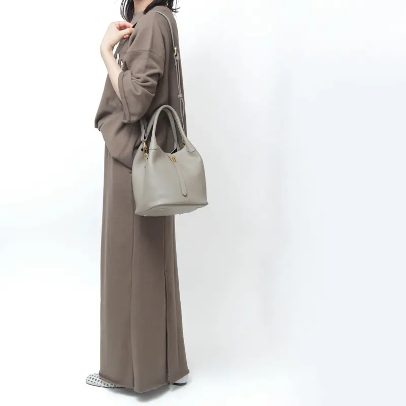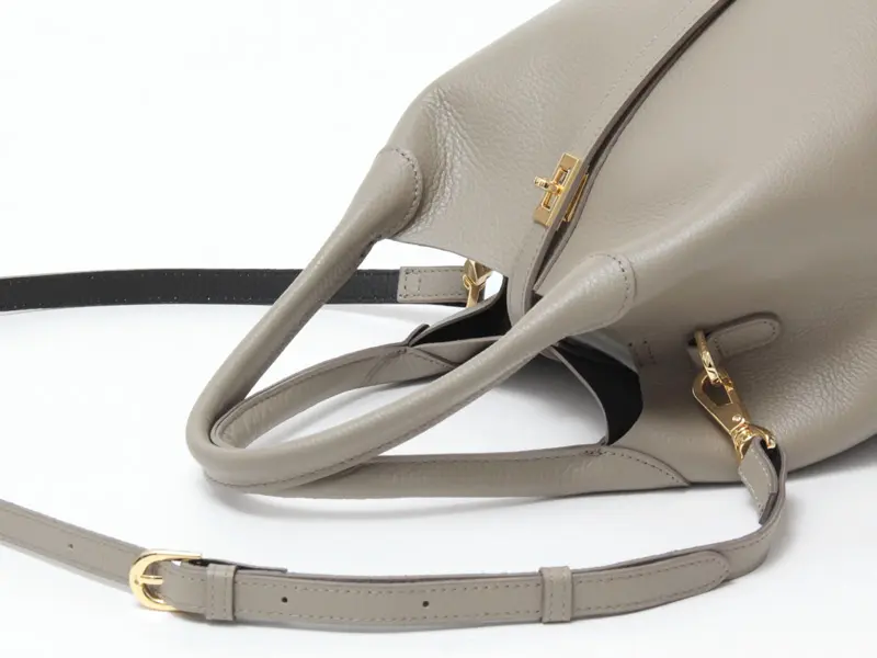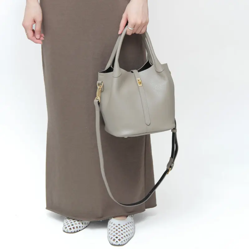 ショルダーストラップは取り外し可能で、その日の気分やスタイルに合わせた使い分けが可能です。 凛とした手持ちスタイル、軽やかな肩掛け、そしてアクティブな斜め掛け。 クロスボディにすれば両手が自由になり、ショッピングや旅行、自転車での移動も快適にサポートします。 フロントの金具が放つ繊細な輝きが、いつものコーディネートをワンランク上の仕上がりへと導きます。