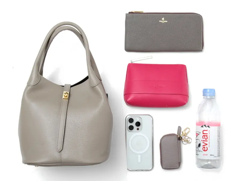 開閉部は、防犯面でも安心感のあるターンロック付きベルト仕様を採用。 奥行きのあるマチ幅を確保しているため、長財布やポーチといった毎日の必需品はもちろん、 500mlのペットボトルもすっきりと収まる頼もしい収納力を備えています。