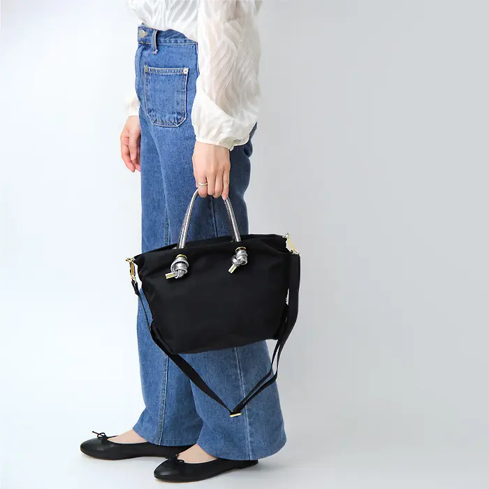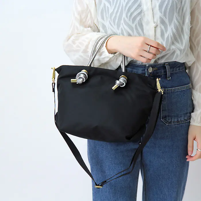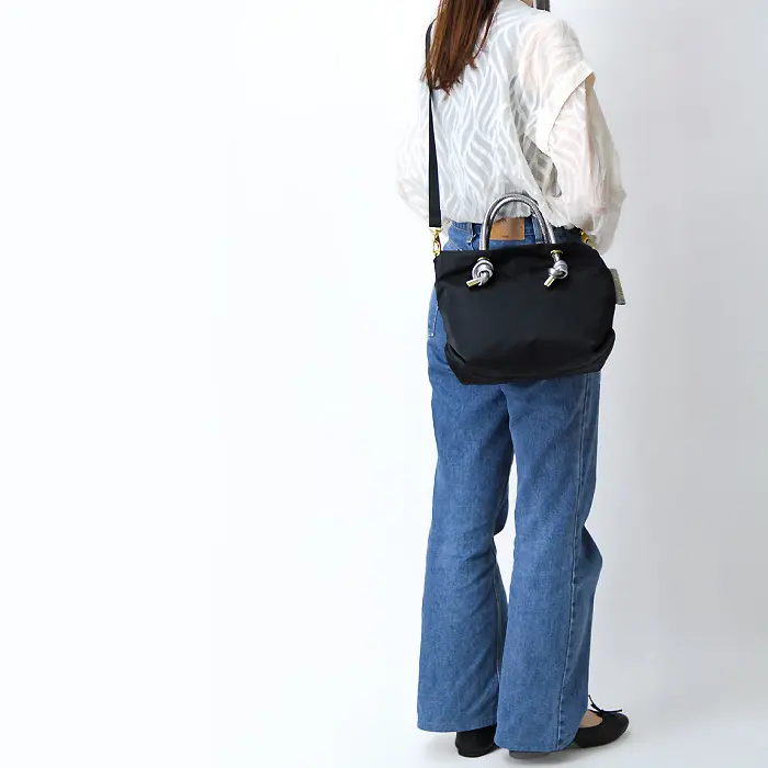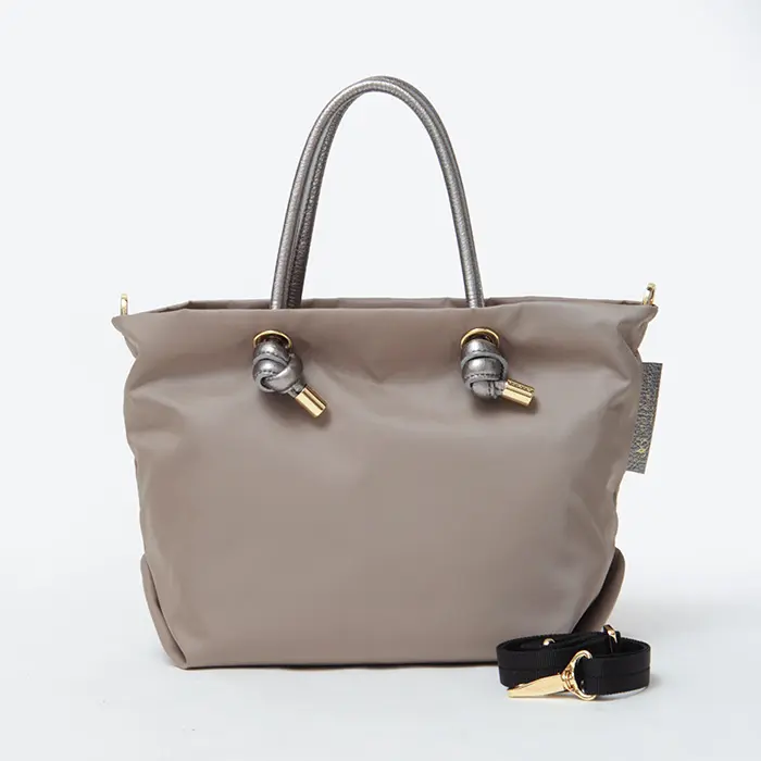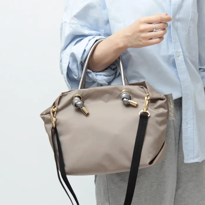 ノット(結び目)がポイントのハンドルはレザー仕立てでナイロンのカジュアル感に上品さをプラスします。ショルダーストラップが付いているので斜めがけもできる2way仕様。お出かけやお子様とのお出かけもにも最適です。ゴールドの金具を使うことで、アクティブな日のカジュアルスタイルも女性らしく仕上げてくれます。