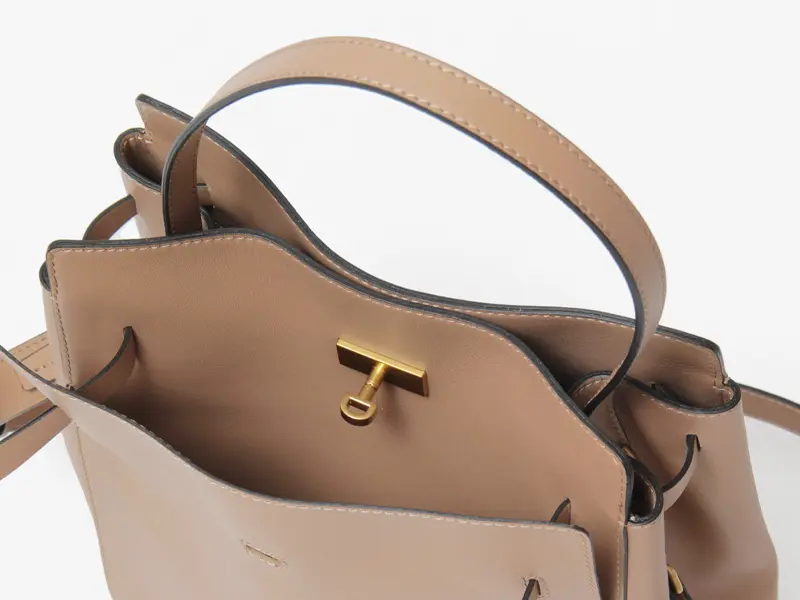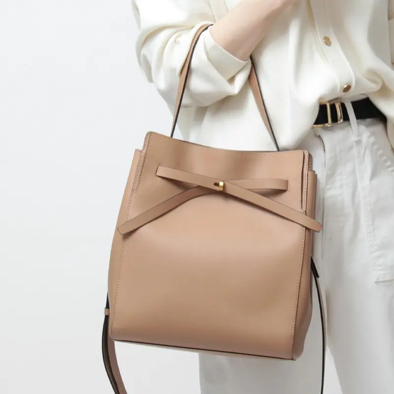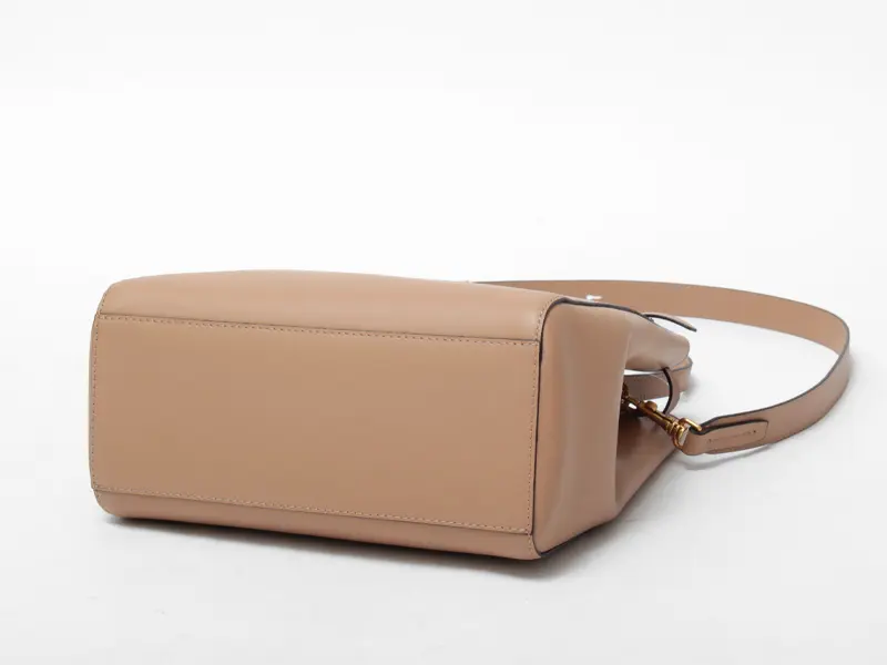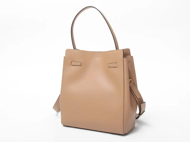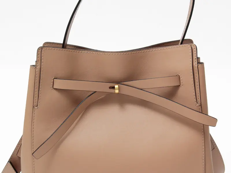 本体素材は滑らかなスムースレザーです。シンプルなバッグに正面のベルトが互い違いになっており、リボンのようなデザインが魅力的です。