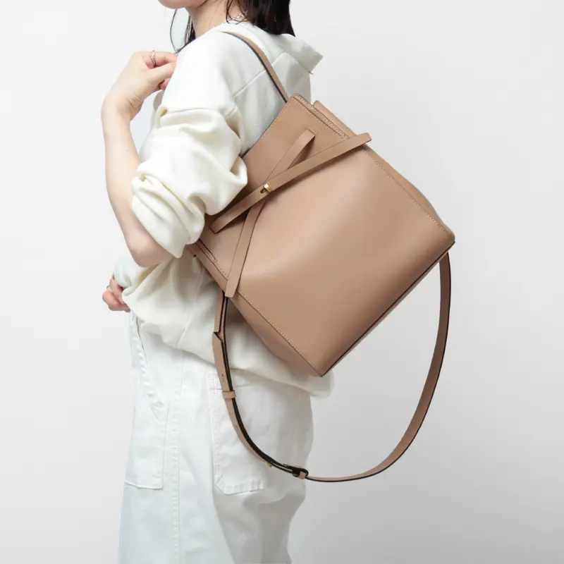 ハンドルは程よい長さで肩掛けも可能なので、使い勝手が良いのが魅力◎ギボシ留めで長さ調節可能です。太めのストラップが肩への負担を軽減します。両手が空き、通勤やお出かけに便利お使いいただけます。アンティークゴールドの金具が風合いを引き立てます。