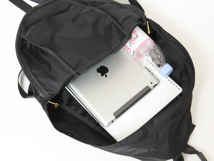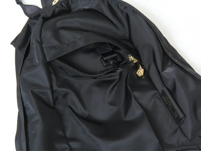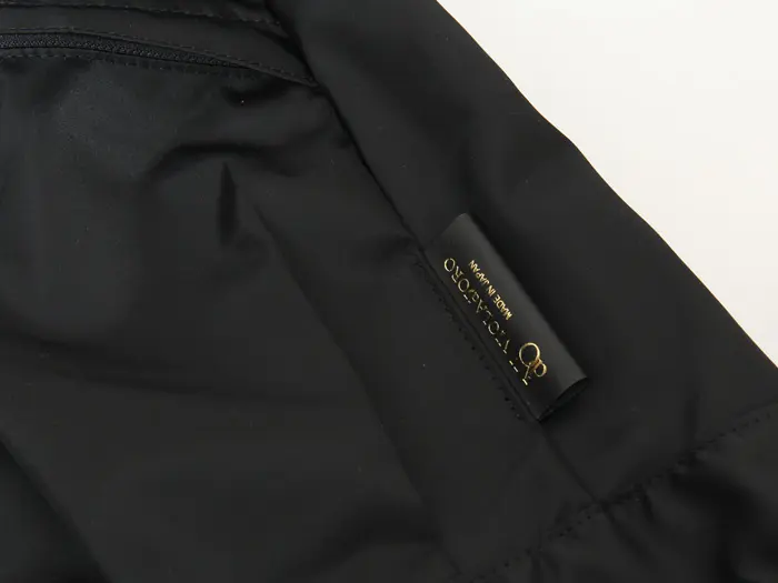 開閉はダブルファスナー仕様。左右どちらの肩に掛けたままでも開閉しやすいデザインです。A4サイズが収まる大きさで、マチ幅もあるので通勤用やお子さんの着替えを入れるマザーズバッグにもお使いいただけます。背中側に大きさの異なる内ポケットが3つ備わっており、小物も整理して収納できます。