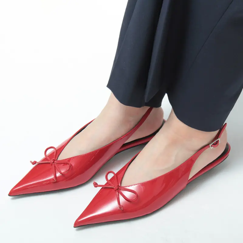 しなやかな光沢が目を引くエナメルレザーを使用した、TONY BIANCO(トニービアンコ)のスリングバックシューズ。ポインテッドトゥに小さなリボンを添えたデザインは、甘さを抑えつつも女性らしさを引き立てる一足です。低めのヒールで安定感があり、上品さと快適な履き心地を両立。パンツスタイルやスカートにも好相性で、オンオフ問わず幅広いシーンに活躍します。