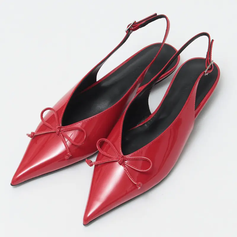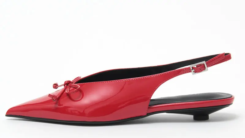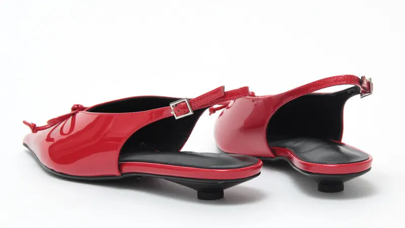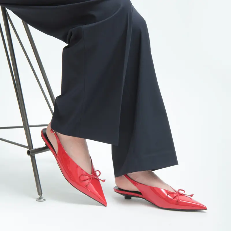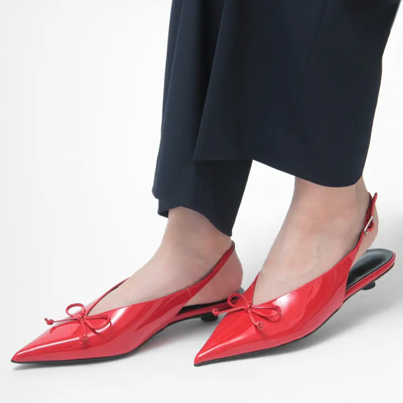 約2.5cmのボタンヒールで仕立てた、安定感のあるローヒール。スリングバックの程よい抜け感が軽やかな印象を与え、低めのヒールながらも脚をすらりと見せてくれます。