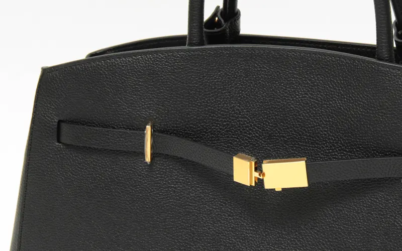 開閉はゴールドのフック金具仕様。ショルダーを取り付けるDカンが内側に配置されており、バッグのシルエットを損なわない設計です。