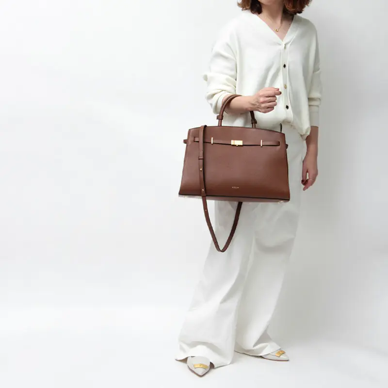ハンドルは2つのレザーハンドルホルダーが付いた女性らしい丸手仕様。取り外し可能な牛革のショルダーストラップは、ギボシ留めでお好みの長さに調節していただけます。細めのストラップは肩がけや斜めがけスタイルも上品に。クロスボディなら両手が空き、通勤やアクティブな日にも便利にお使いいただけます。