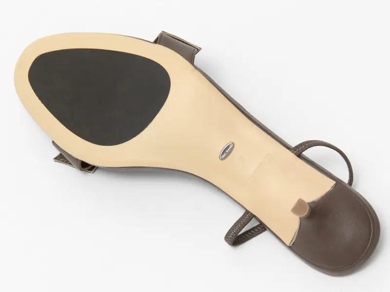 甲の高い位置にストラップを配し、踵が浮きにくい設計。ストラップはゴム仕様で踵にしっかりフィット。見た目よりも安定感のある履き心地です。