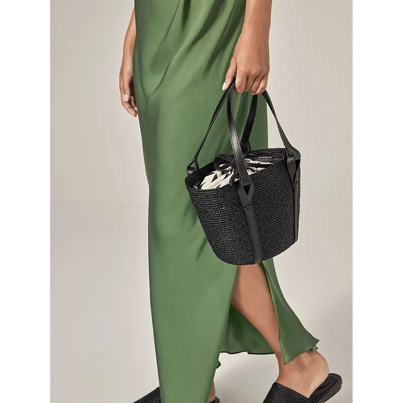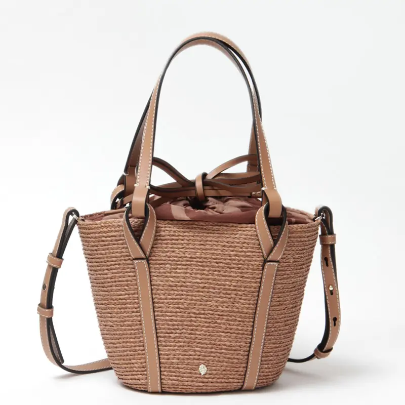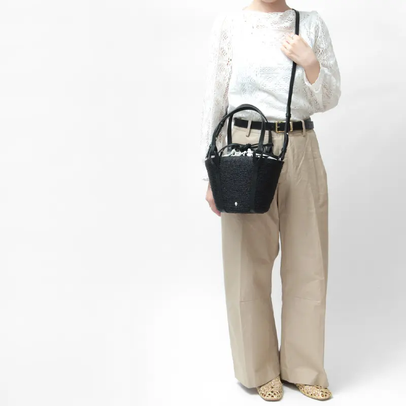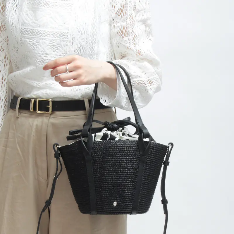 天然素材の涼しげな風合いに、レザー使いで格調をプラス。ハンドルやステッチのラインに至るまで丁寧にデザインされており、手にするだけで上質さが伝わる一品。リラックス感のある大人カジュアルスタイルにマッチし、旅行や週末ランチ、お買い物スタイルまで幅広く活躍します。