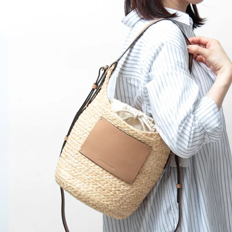 金具を控えたミニマルな佇まいに、編み込まれたナチュラルラフィアと本革ハンドルが夏の装いを格上げする洗練デザイン。リラックス感のある大人カジュアルスタイルにマッチし、旅行や週末ランチ、お買い物スタイルまで幅広く活躍します。