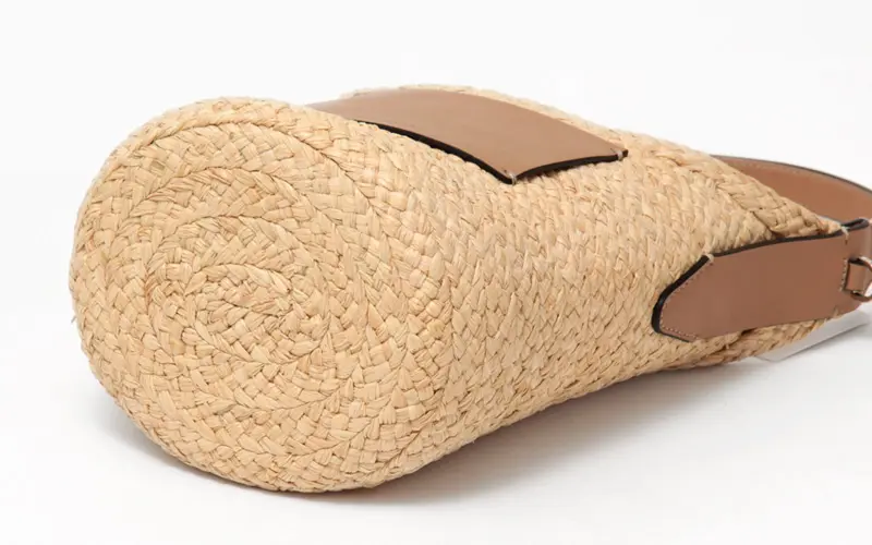 最良質のマダガスカル島の天然素材“ラフィア”を熟練した職人の手作業によって編み上げられたワイドブレードを用いており、LWG 認定のレザートリムで仕上げられています。ラフィア自体がある程度の油分を含んでいるので、とても柔軟性に優れており、時を重ねるごとに柔らかくしなやかになるのが特徴です。