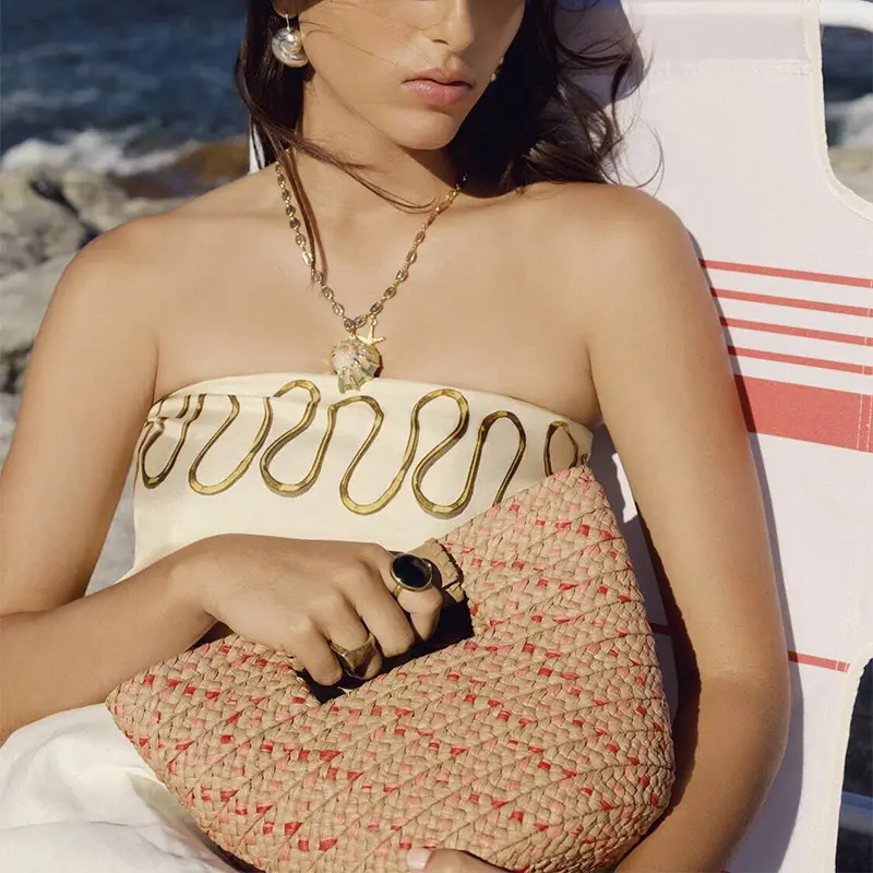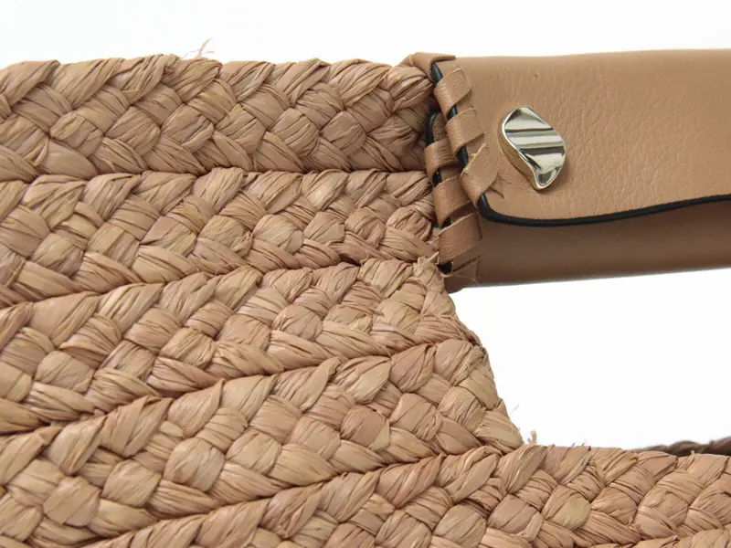 しっかりと編み込まれたナチュラルラフィアに、ハンドル部分のレザーとゴールドの金具が上品なアクセント。リラックス感のある大人カジュアルスタイルにマッチし、旅行や週末ランチ、お買い物スタイルまで幅広く活躍します。