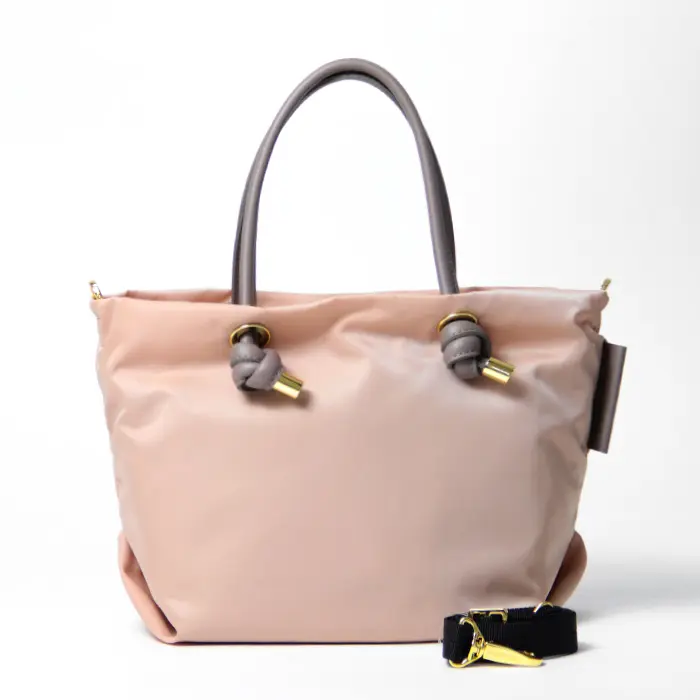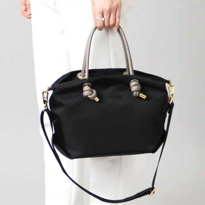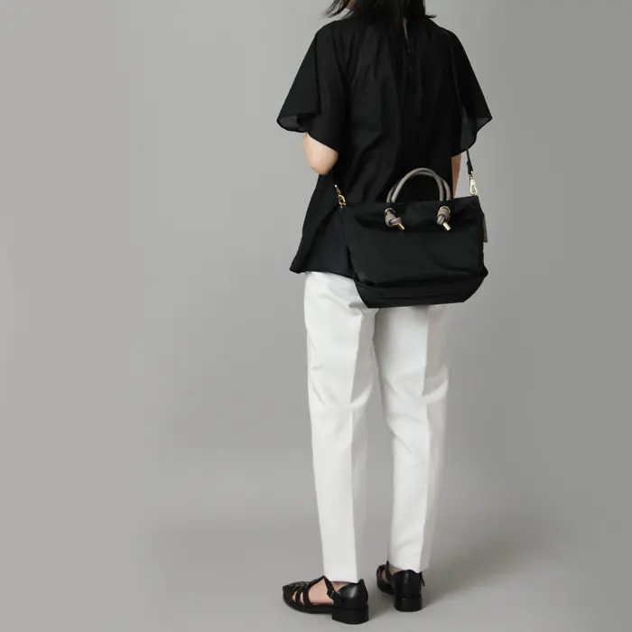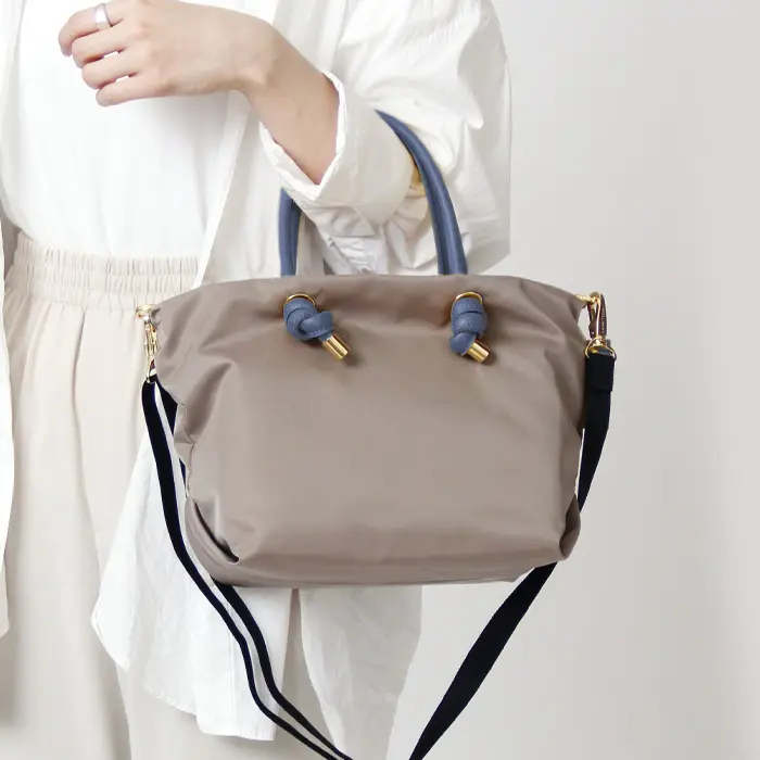 ノット(結び目)がポイントのハンドルはレザー仕立てでナイロンのカジュアル感に上品さをプラスします。ショルダーストラップが付いているので斜めがけもできる2way仕様。お出かけやお子様とのお出かけもにも最適です。ゴールドの金具を使うことで、アクティブな日のカジュアルスタイルも女性らしく仕上げてくれます。