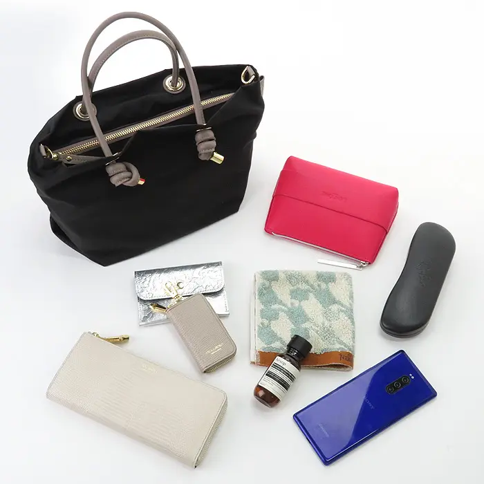 メイン収納はマチ幅がたっぷりとあり、長財布やポーチ、メガネケースなどお出かけの必需品が収まる見た目以上の収納力です。内ポケット付きなので鍵やエコバッグなどの小物も整理して収納できます。本体の素材がとても軽いので荷物をたくさん入れても安心。普段にお出かけに使いやすいサイズ感です。