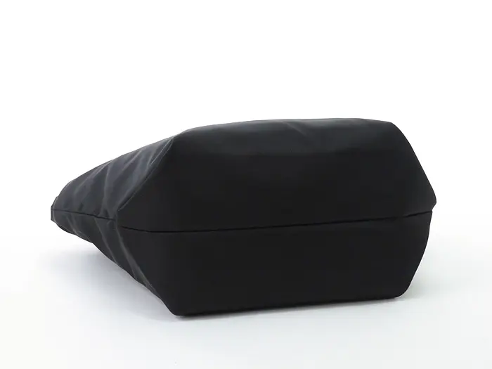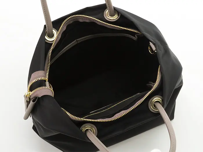 ほんのり光沢感のあるナイロン素材は柔らかく、くしゅっとした表情が軽やかさとこなれた雰囲気を演出します。レザーとのカラーのコントラストが美しく、シンプルながらもコーディネートに華やかさをプラスします。弱撥水ナイロンなので、少々の雨にも対応できます。